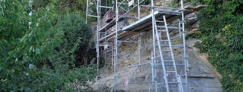 Mur de soutènement à pierre sèche sur Bédarieux, comme on peut le voir sur les photos la difficulté sur ce chantier réside dans l’installation de l’échafaudage et l’apport des pierres… :
