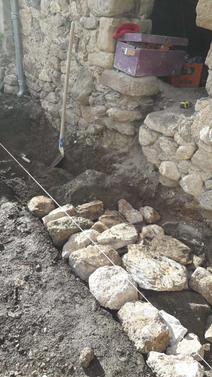 Réparation brèche en sous-oeuvre à pierre sèche – mur de soutènement Château de Clermont L’Hérault 34800