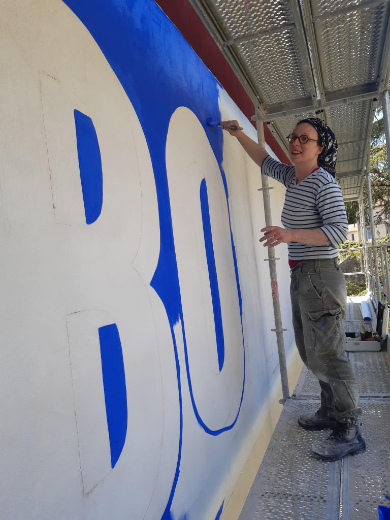 Une fois la couche de finition réalisée, nous nous sommes attachés à restituer la publicité Dubonnet telle qu’elle était auparavant. Nous avons travaillé en collaboration avec Sophie Canillac (peintre en décor du patrimoine)