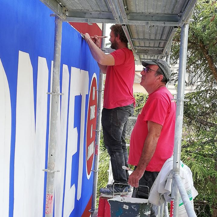 Nous avons tout d’abord appliqué le poncif réalisé par Sophie, puis nous avons peint la publicité à l’aide d’une peinture au silicate. ci-dessous la galerie de photos réalisées :