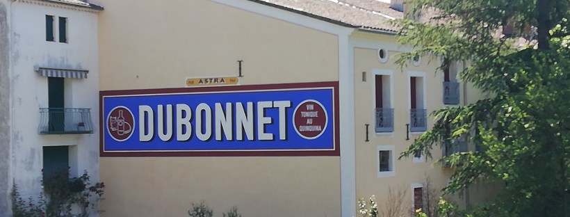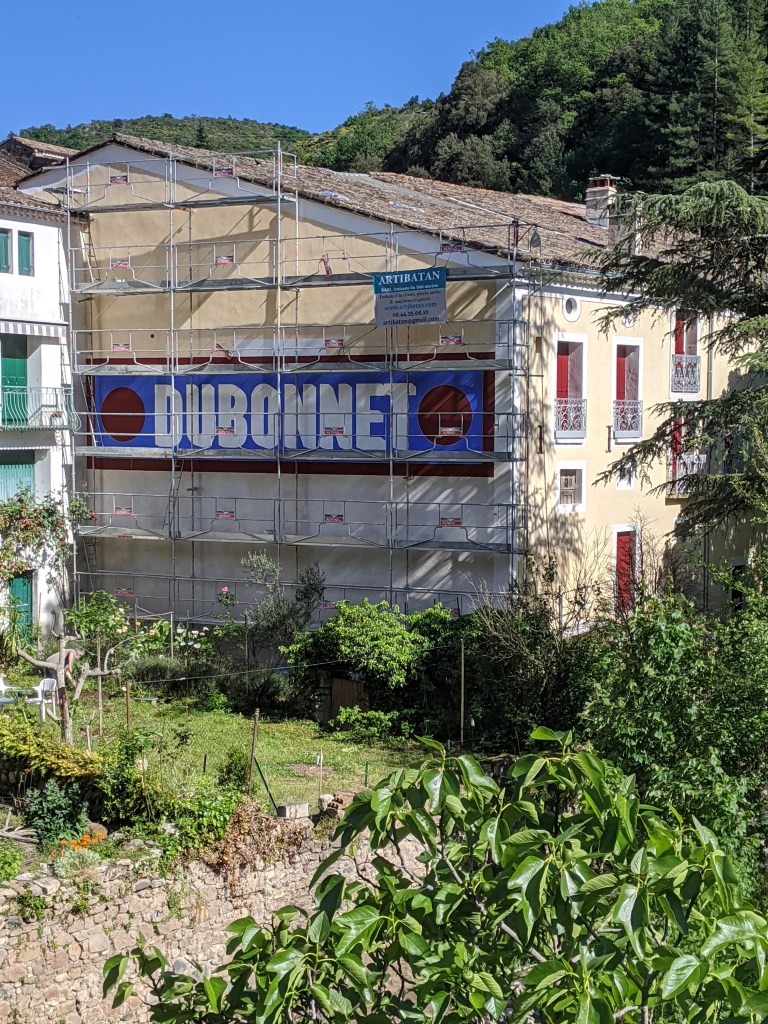 Il s’agit d’une façade en pignon sans ouverture qui présentait les traces d’une ancienne publicité murale peinte « Dubonnet ». Avec l’accord des propriétaires, de la mairie, de l’intercommunalité et de la fondation du patrimoine, nous avons proposé la restitution de cette publicité. Nous avons donc réalisé les relevés avant le piquetage de l’ancien enduit