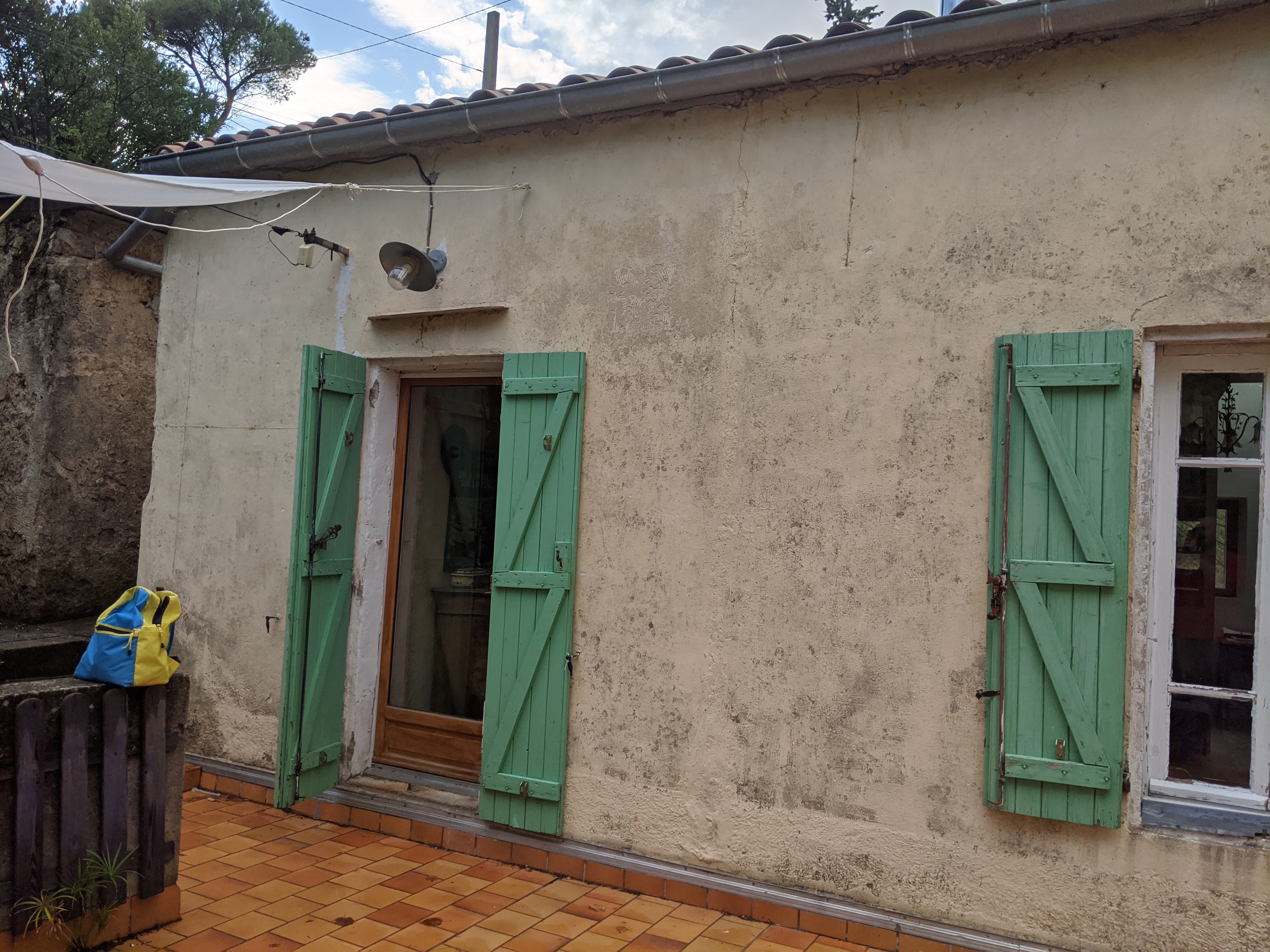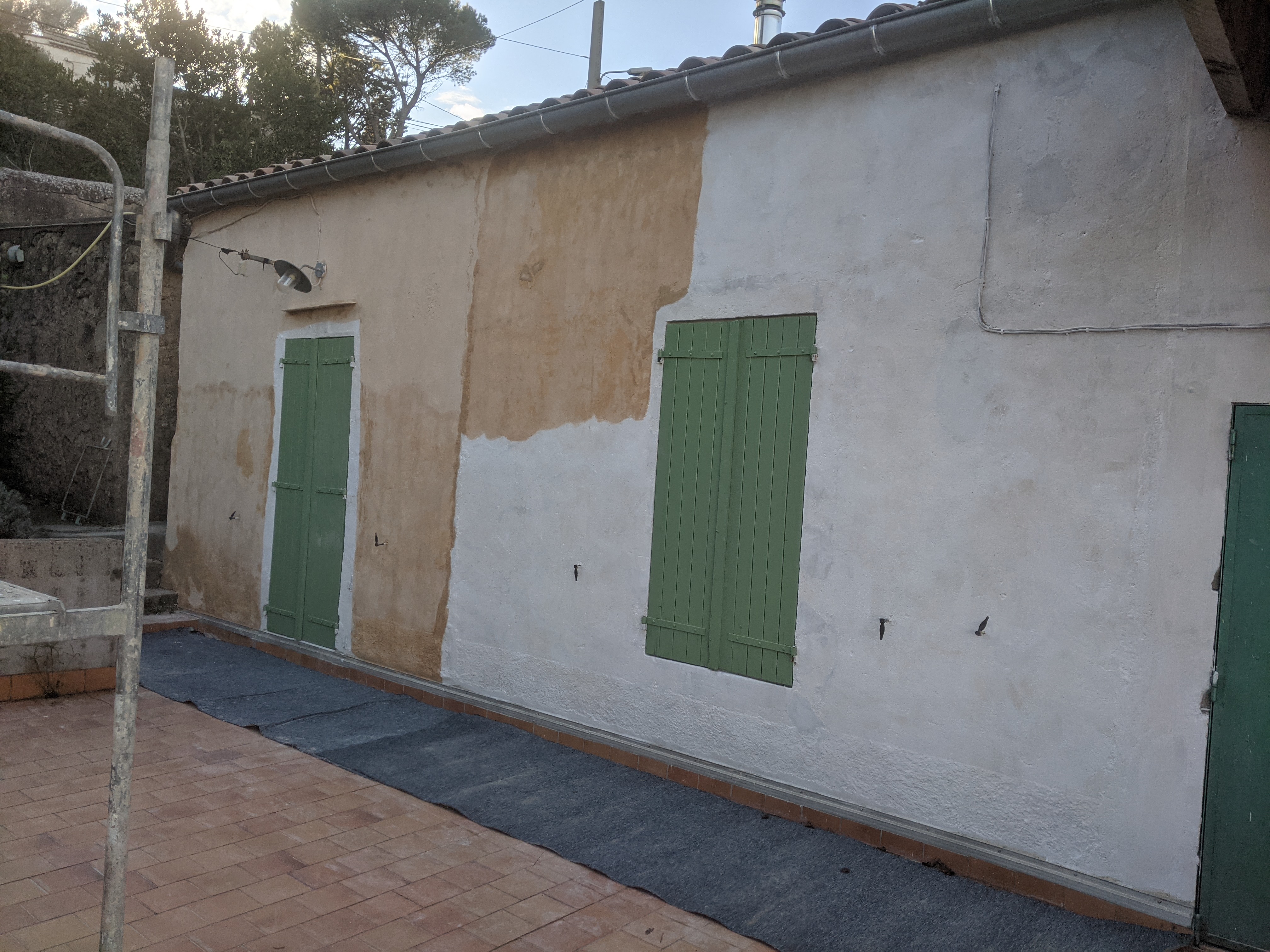 Réalisation de badigeons de chaux sur enduit chaux et de peintures au silicate sur enduit ciment après un nettoyage haute pression de la façade et une reprise des fissures.
