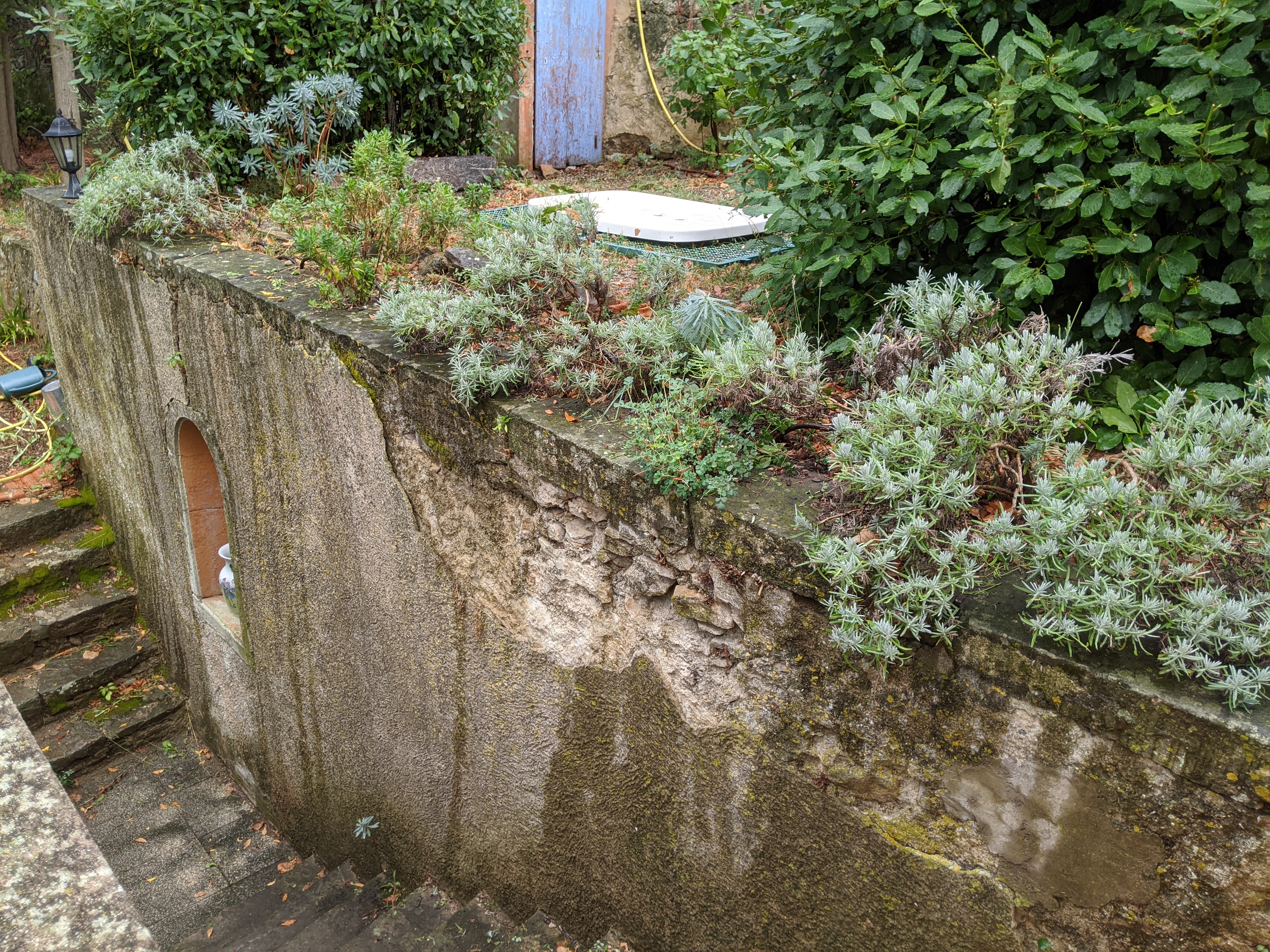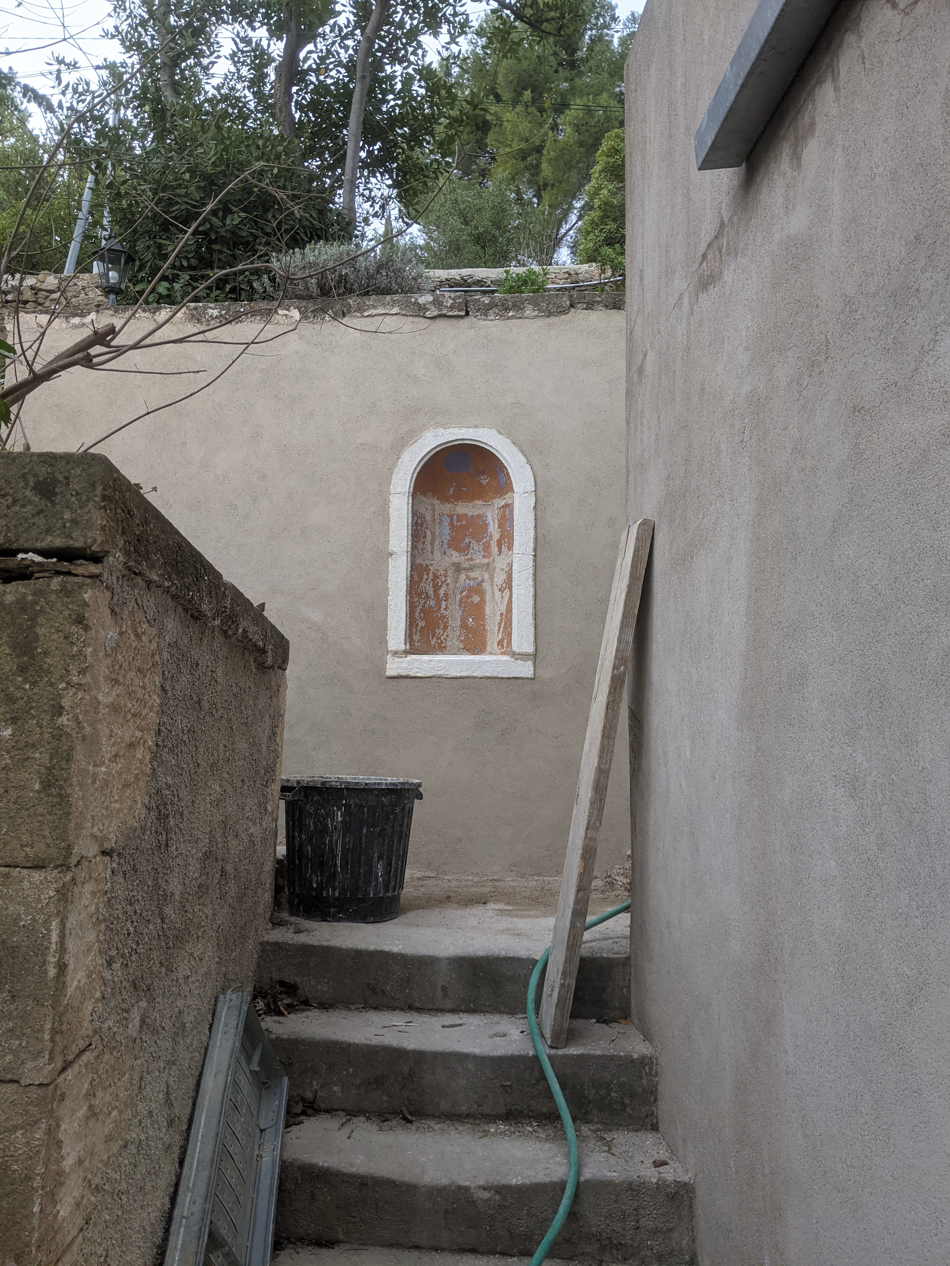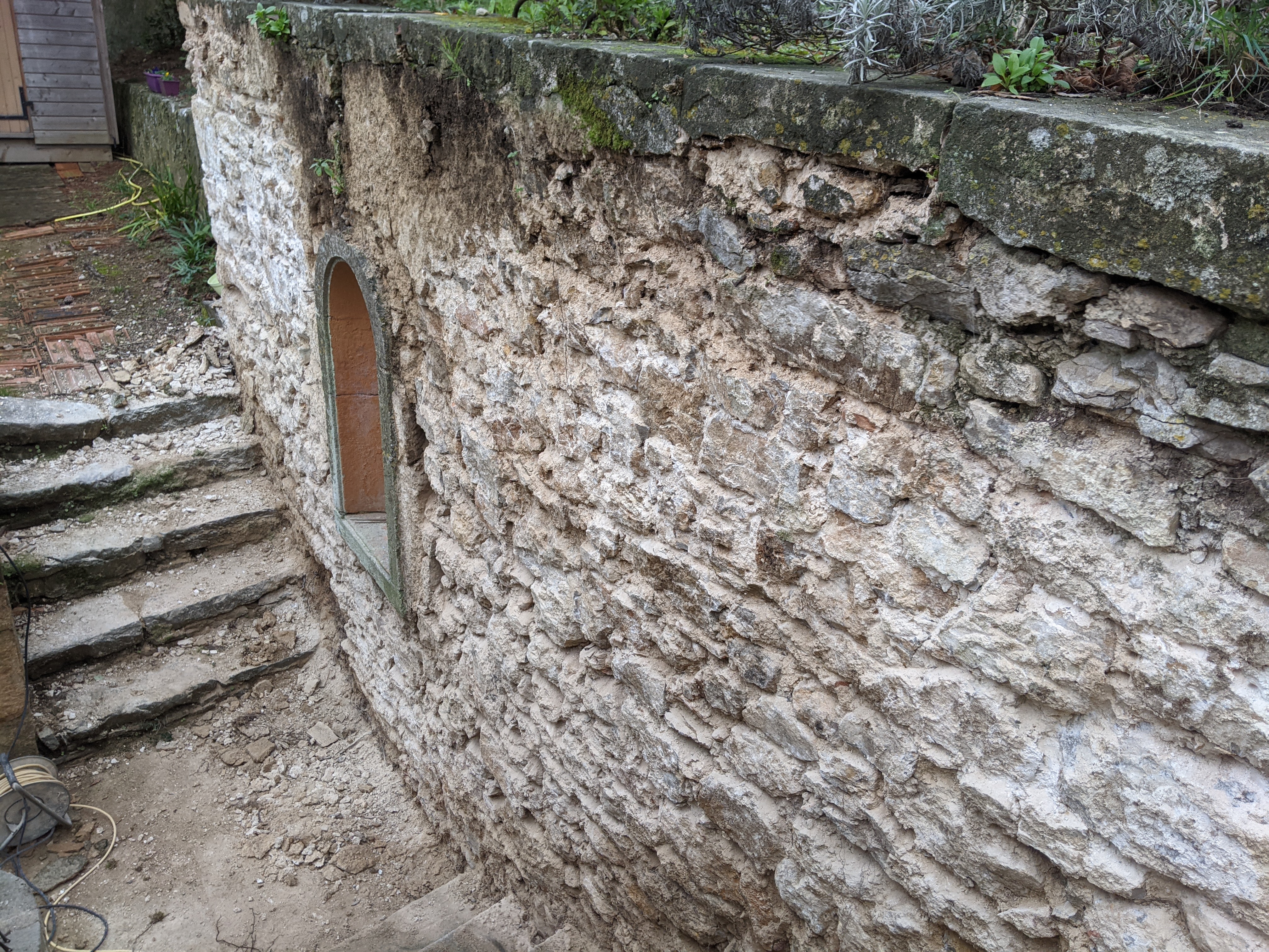 Piquetage complet d’un enduit chaux d’un mur de soutènement le long de l’escalier qui monte à l’habitation et réalisation d’un nouvel enduit chaux en 3 passes avec badigeon coloré et reprise d’une niche en pierre de taille.