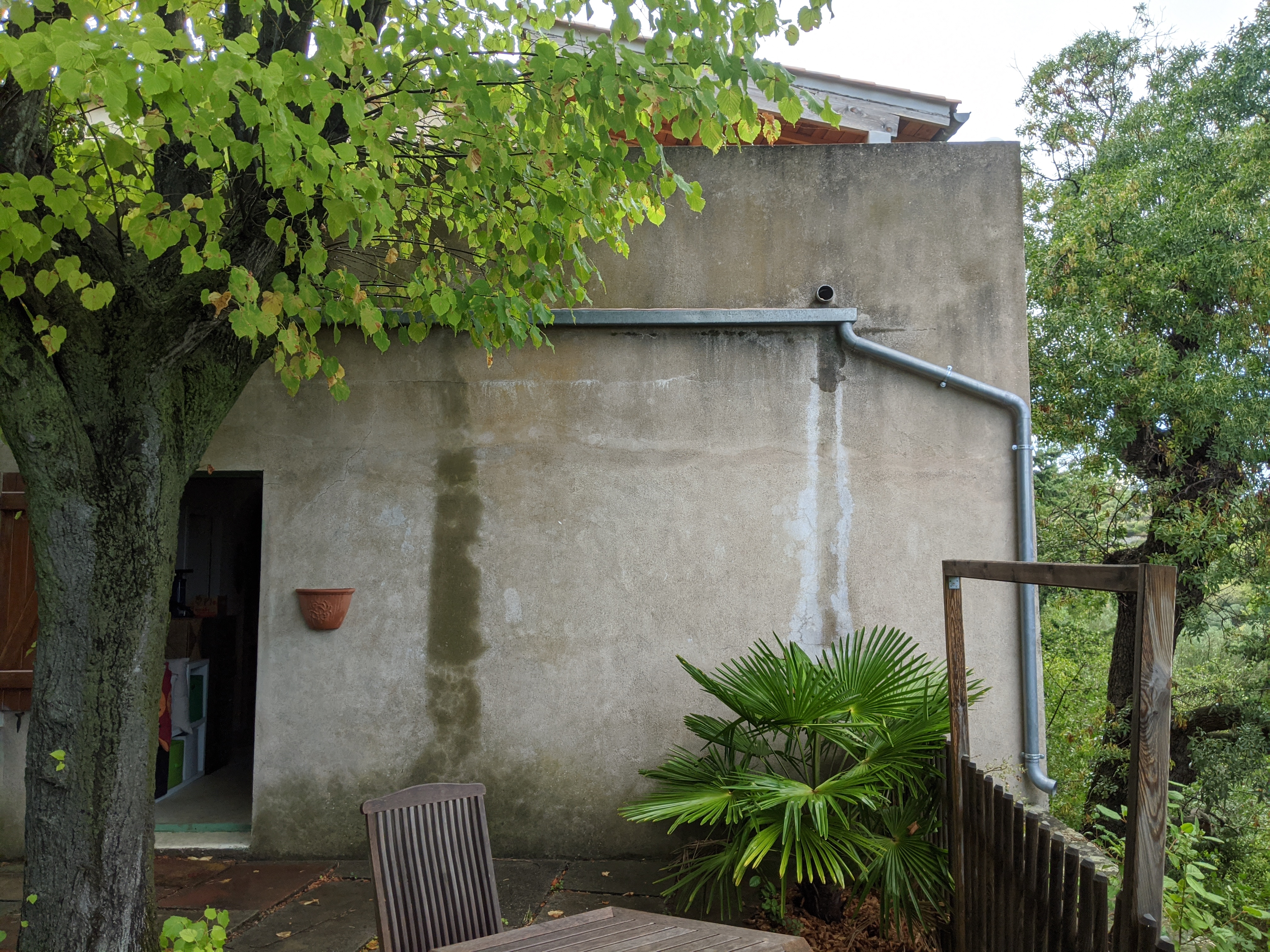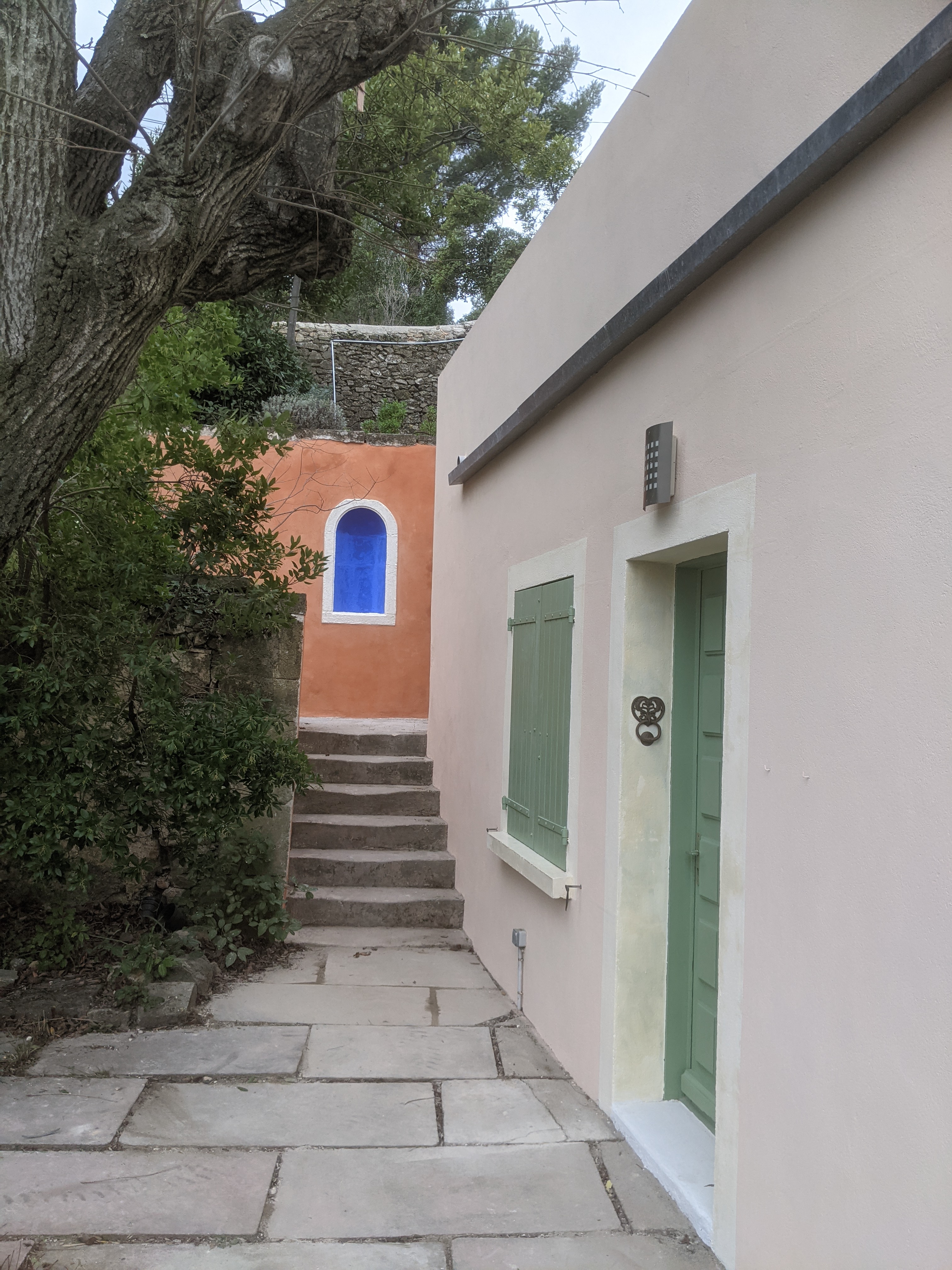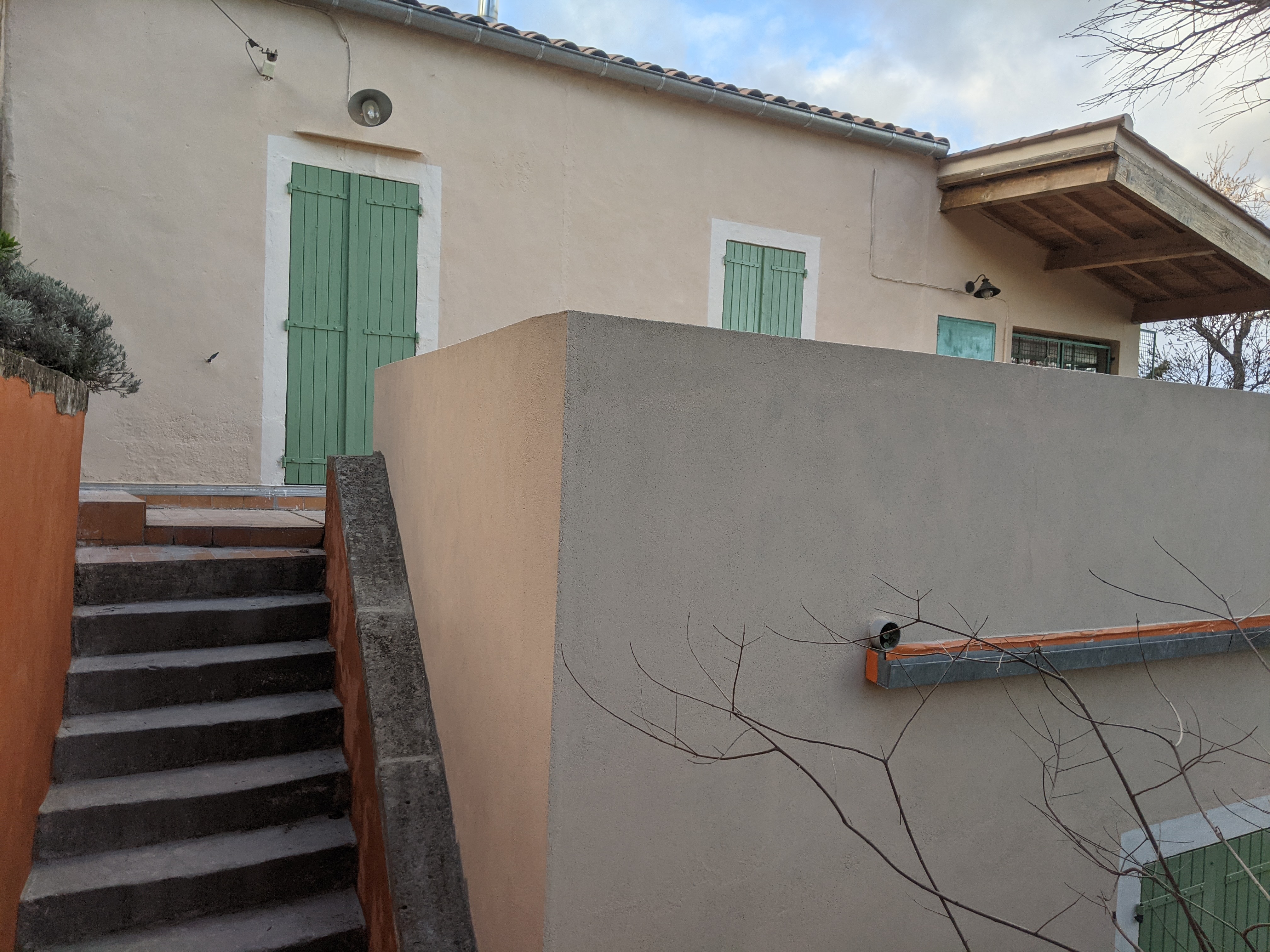 Piquetage complet d’un enduit chaux d’un mur de soutènement le long de l’escalier qui monte à l’habitation et réalisation d’un nouvel enduit chaux en 3 passes avec badigeon coloré et reprise d’une niche en pierre de taille.