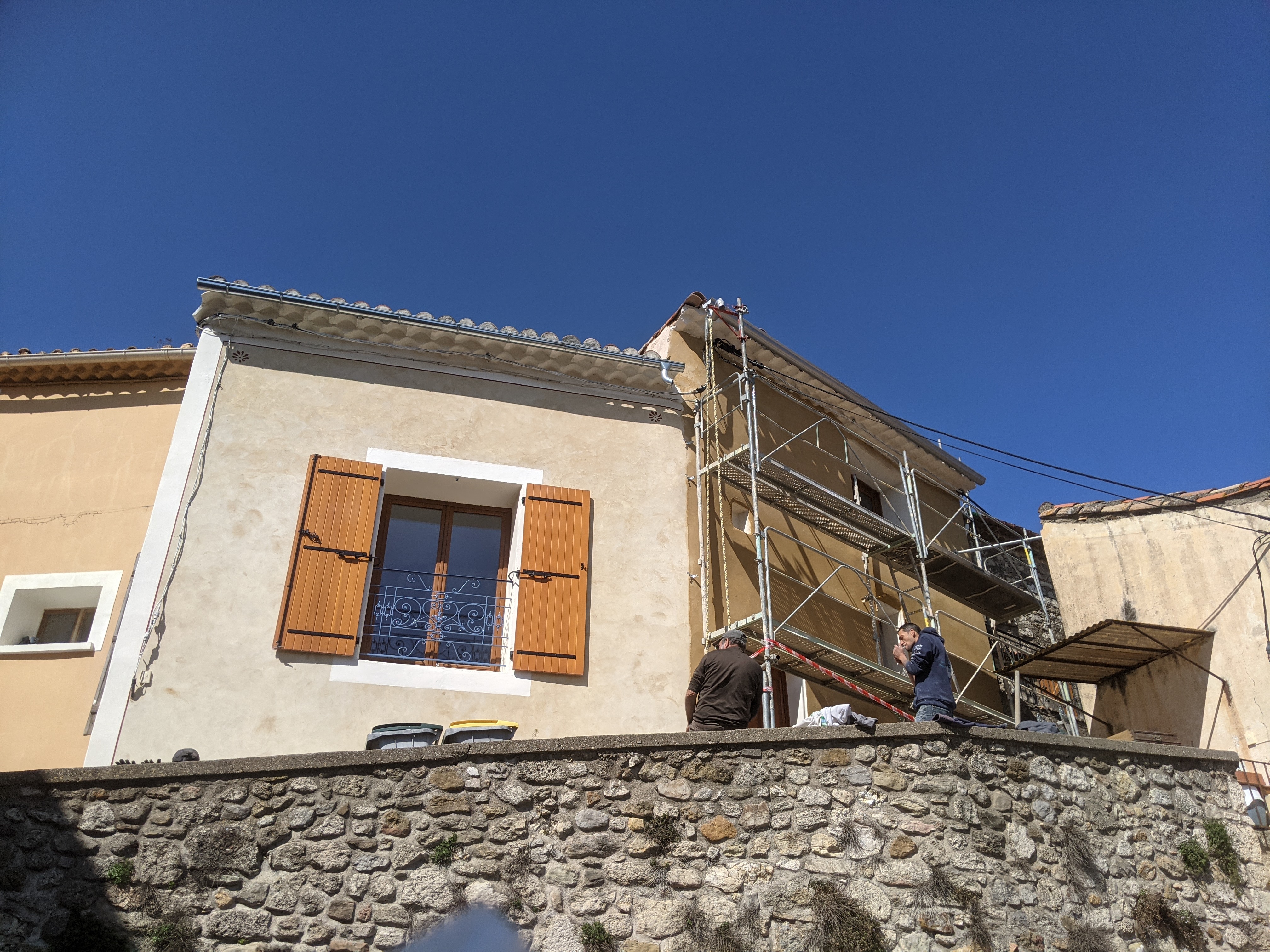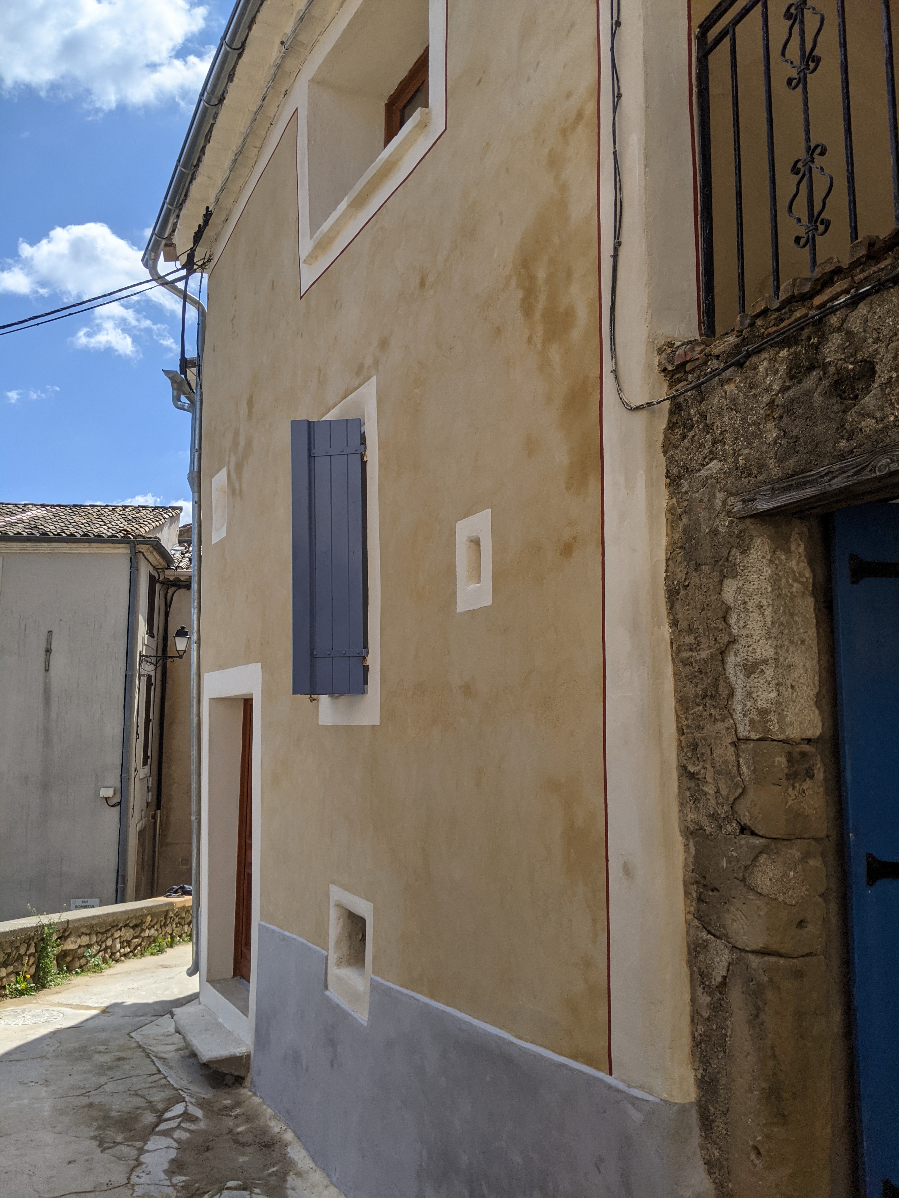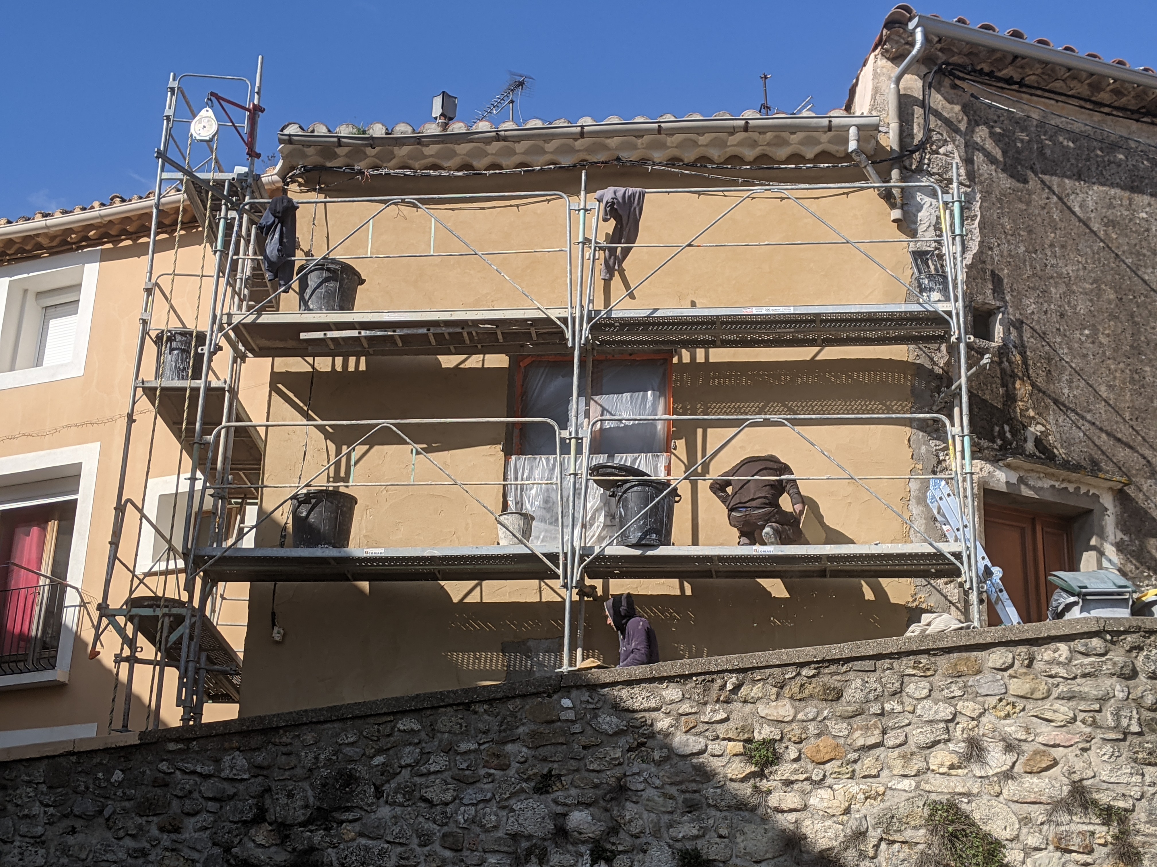 Réalisation d’un enduit chaux en trois passes (dégrossi, corps d’enduit et finition) après piquetage des anciens enduits ciment pour la partie basse et à la chaux pour les parties hautes (mais complètement soufflés).