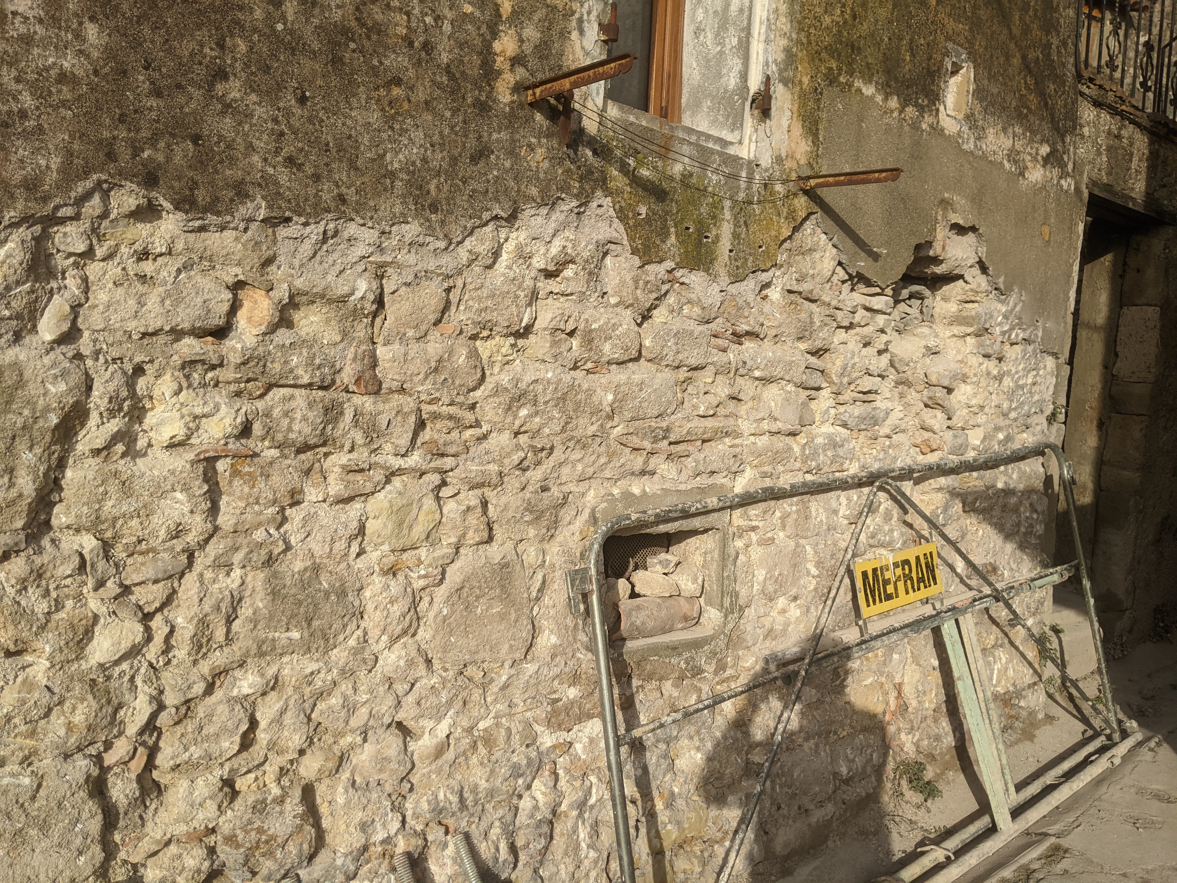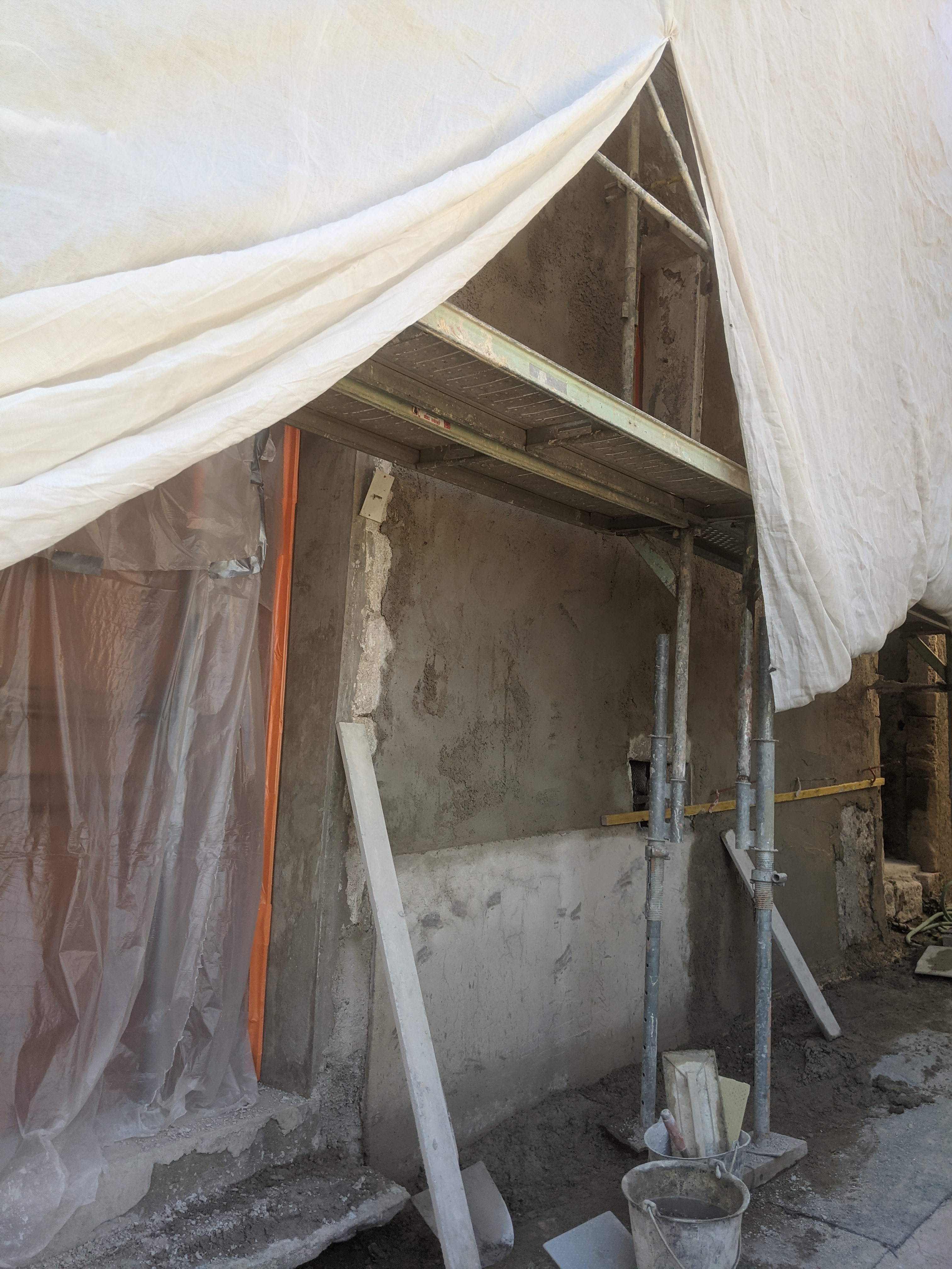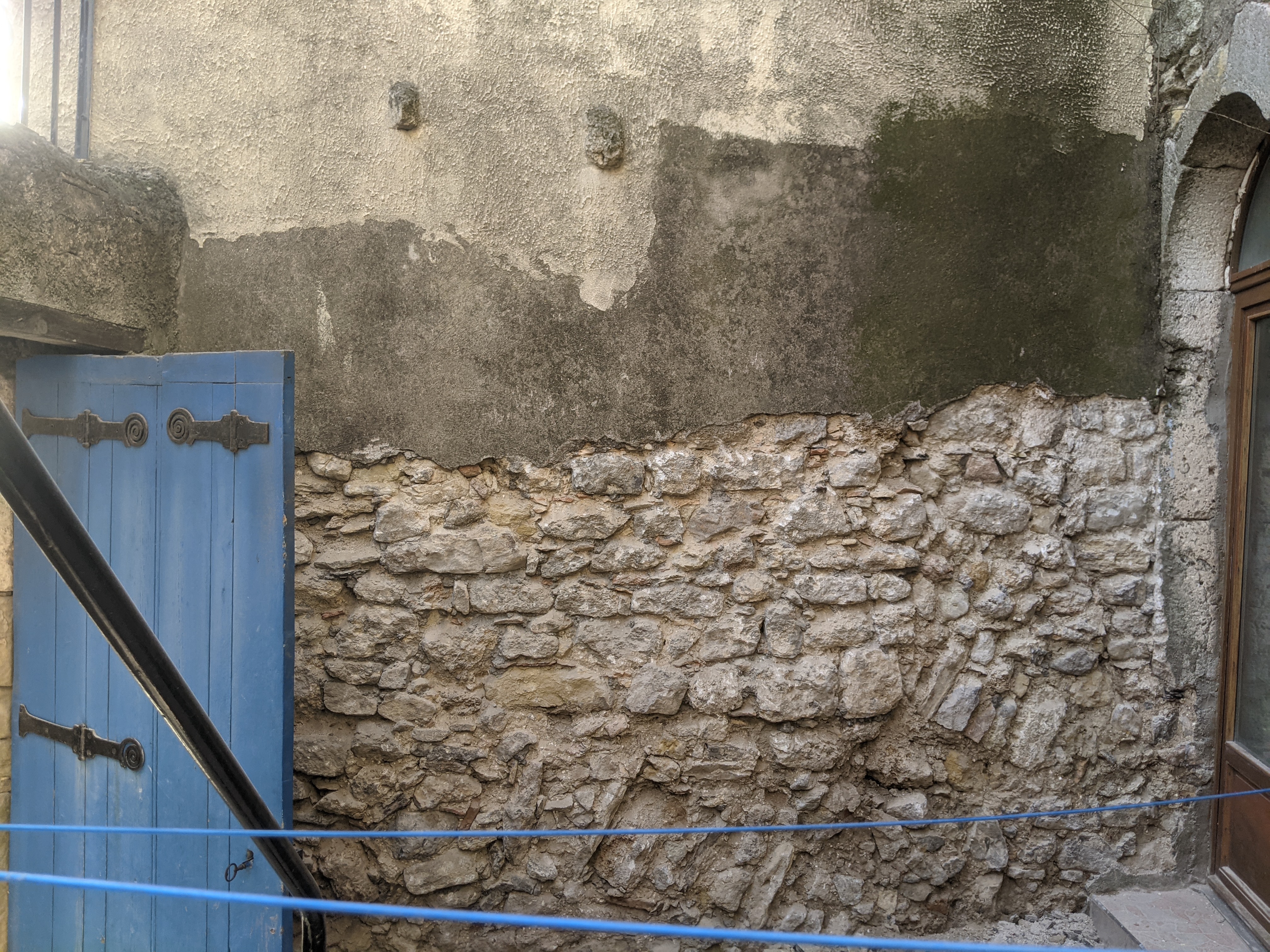 Réalisation d’un enduit chaux en trois passes (dégrossi, corps d’enduit et finition) après piquetage des anciens enduits ciment pour la partie basse et à la chaux pour les parties hautes (mais complètement soufflés).