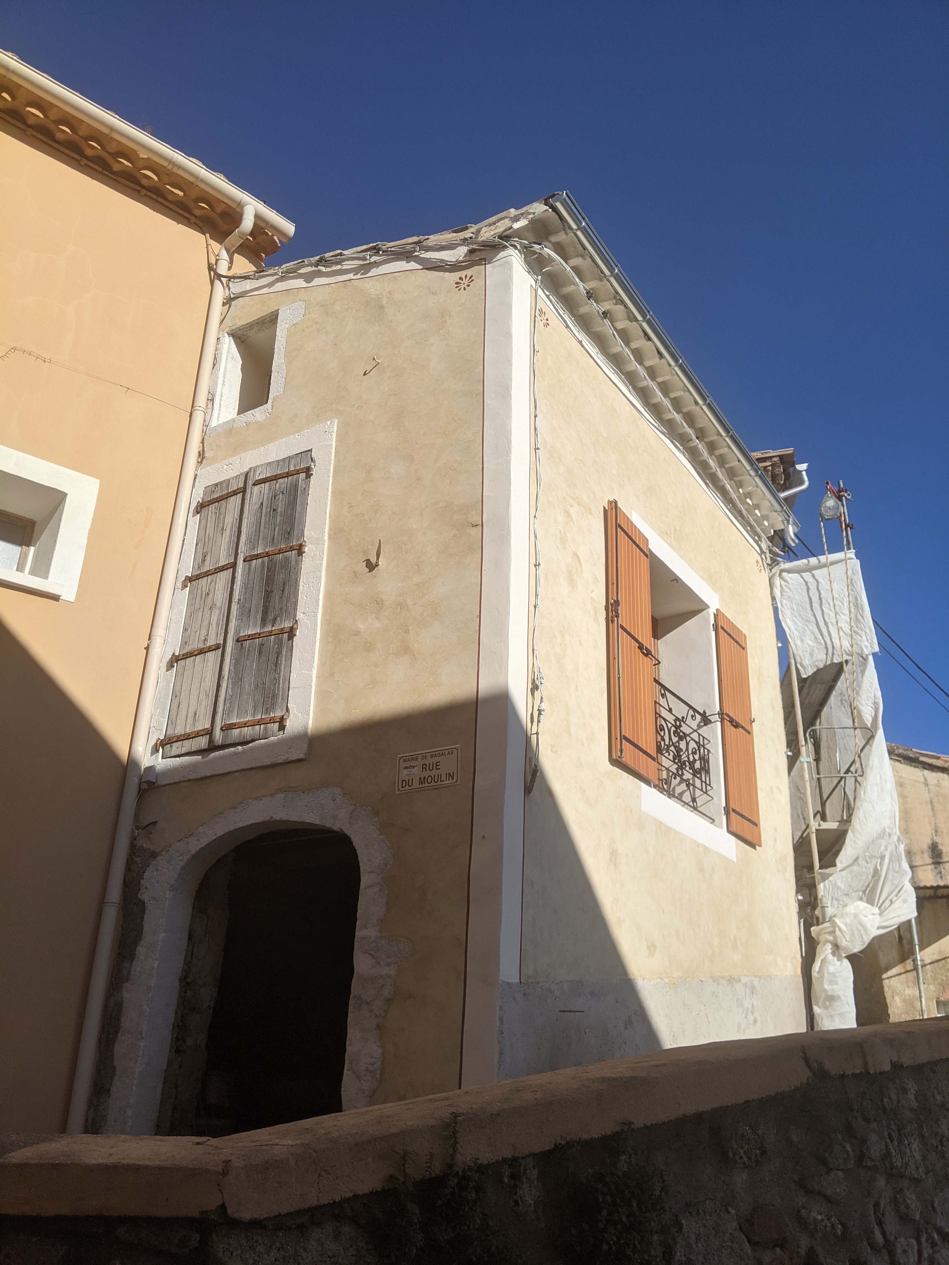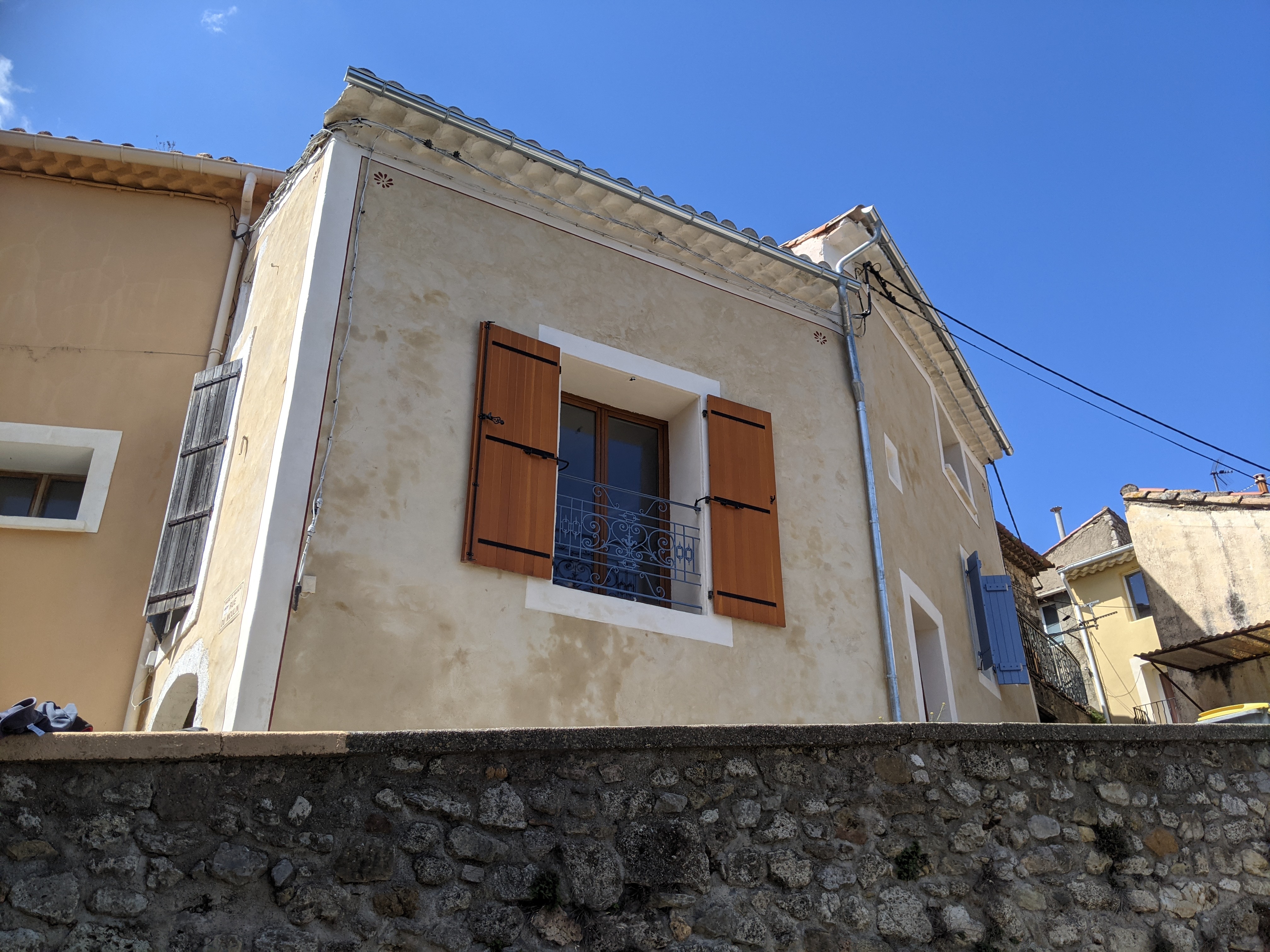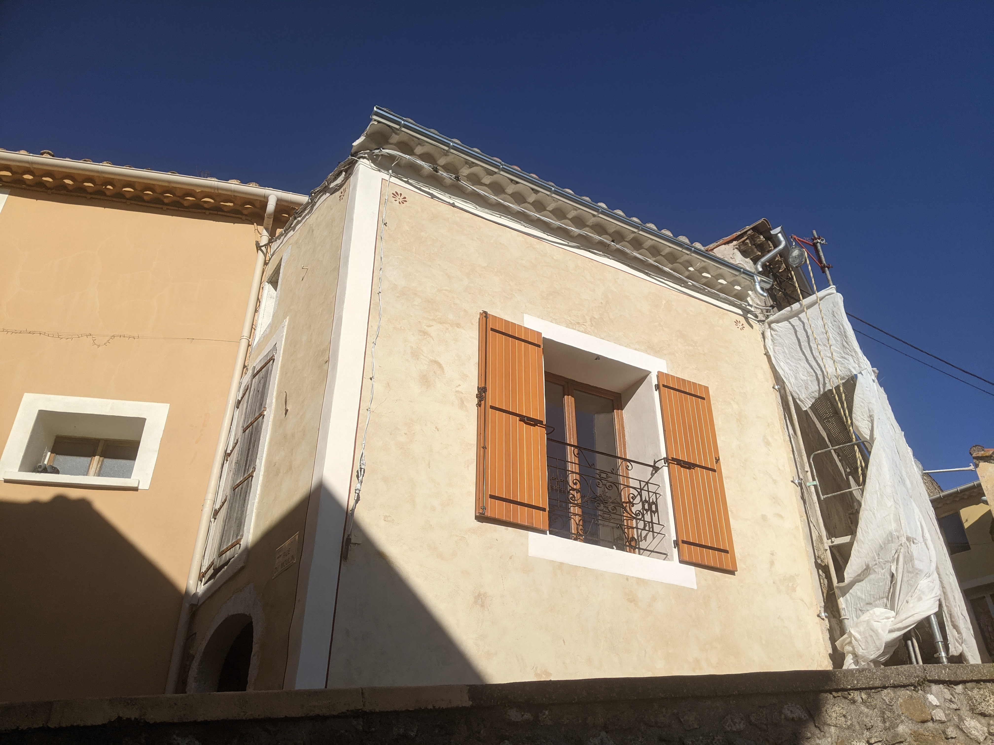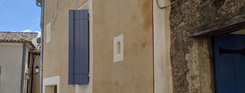 Mortiers réalisés par nos soins avec de la chaux NHL 3,5 pour le dégrossi et le corps d’enduit, et une finition à la chaux aérienne CL90 avec un sable jaune et un peu de pigment dans la masse pour accentuer la couleur.