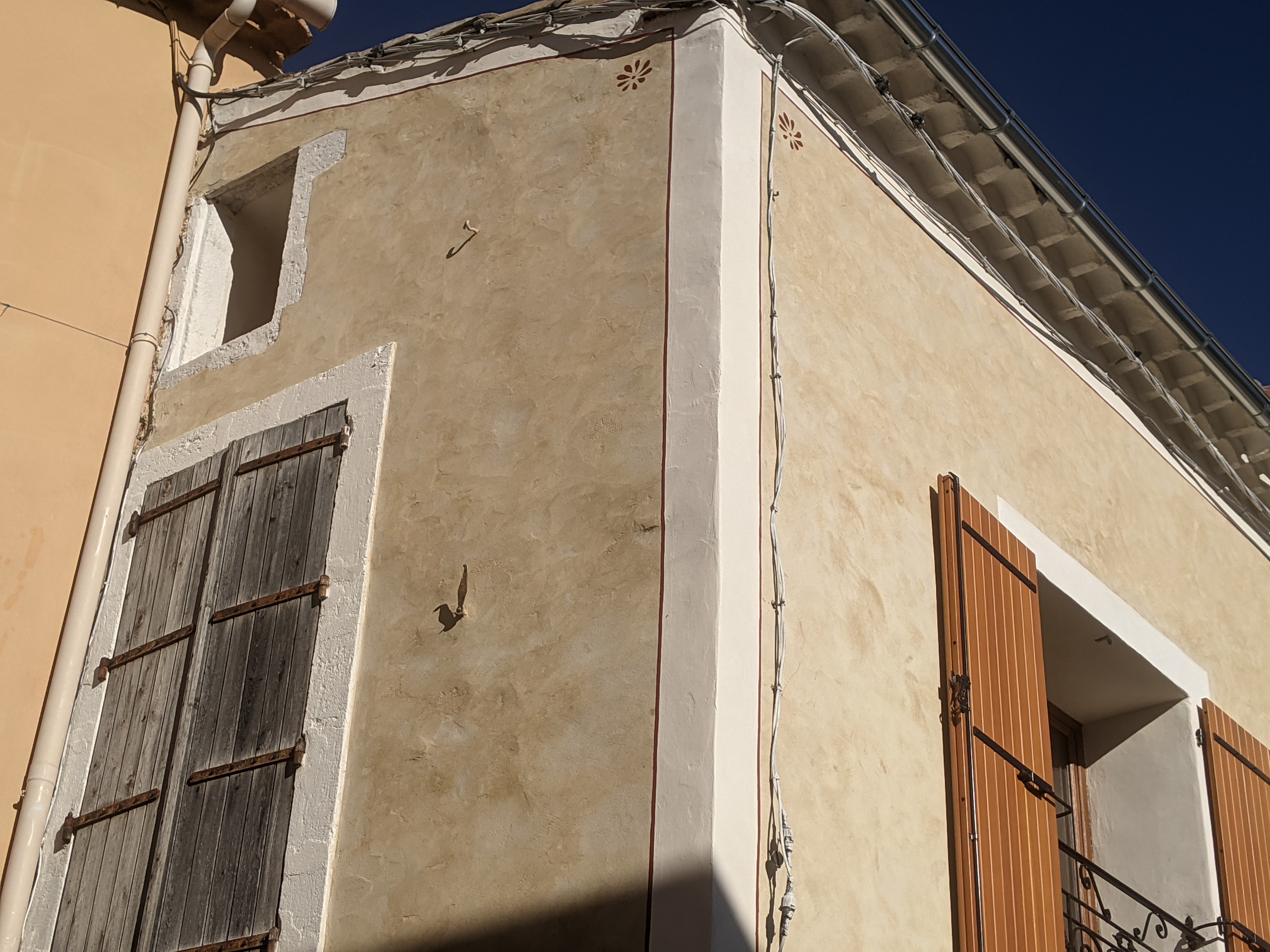 Afin de donner du relief à cette façade nous avons réalisé des bandeaux périphériques blancs en 3 passes avec un badigeon réalisé avec de la chaux aérienne en pâte. Un Filet rouge permet de faire la liaison entre l’enduit et les bandeaux.