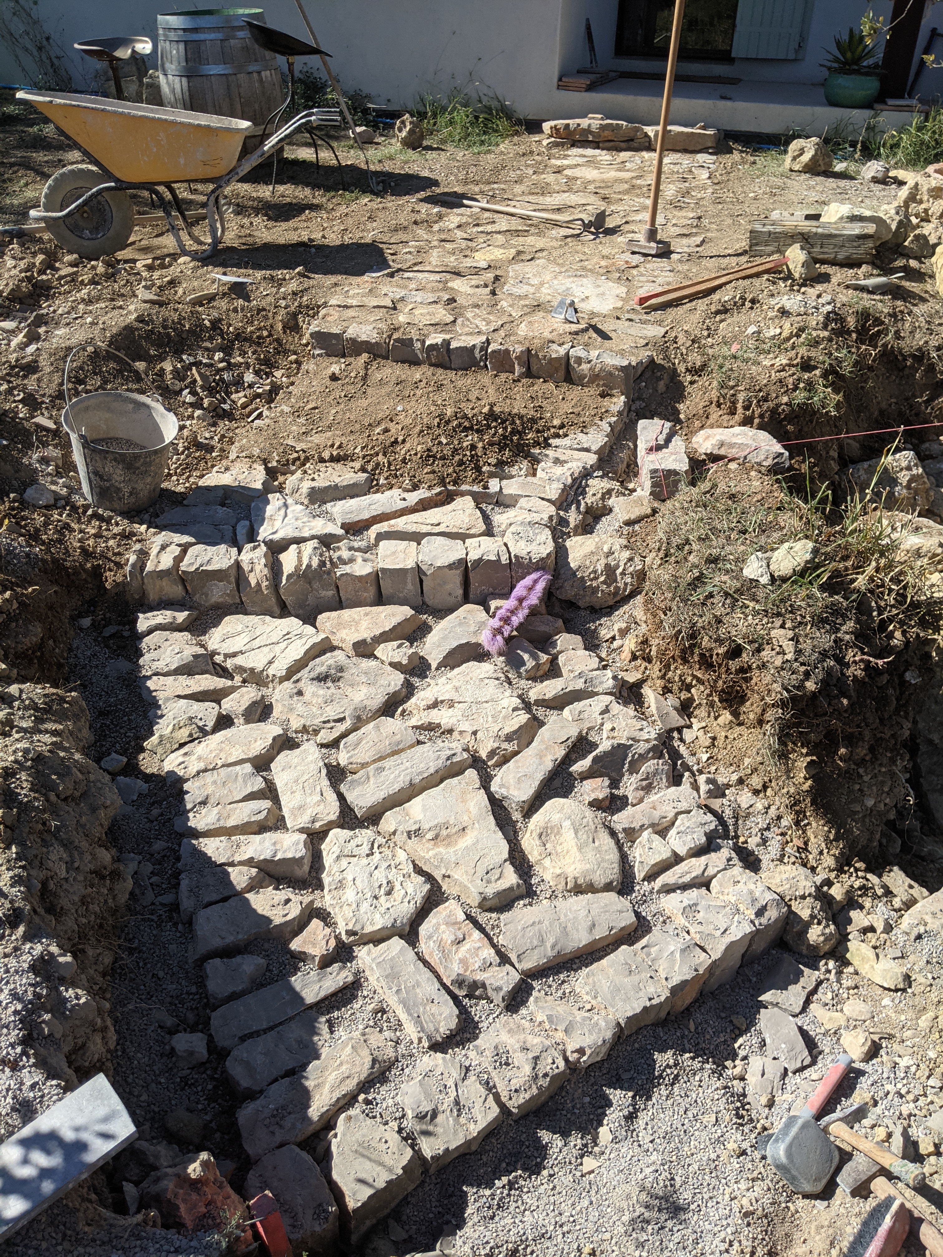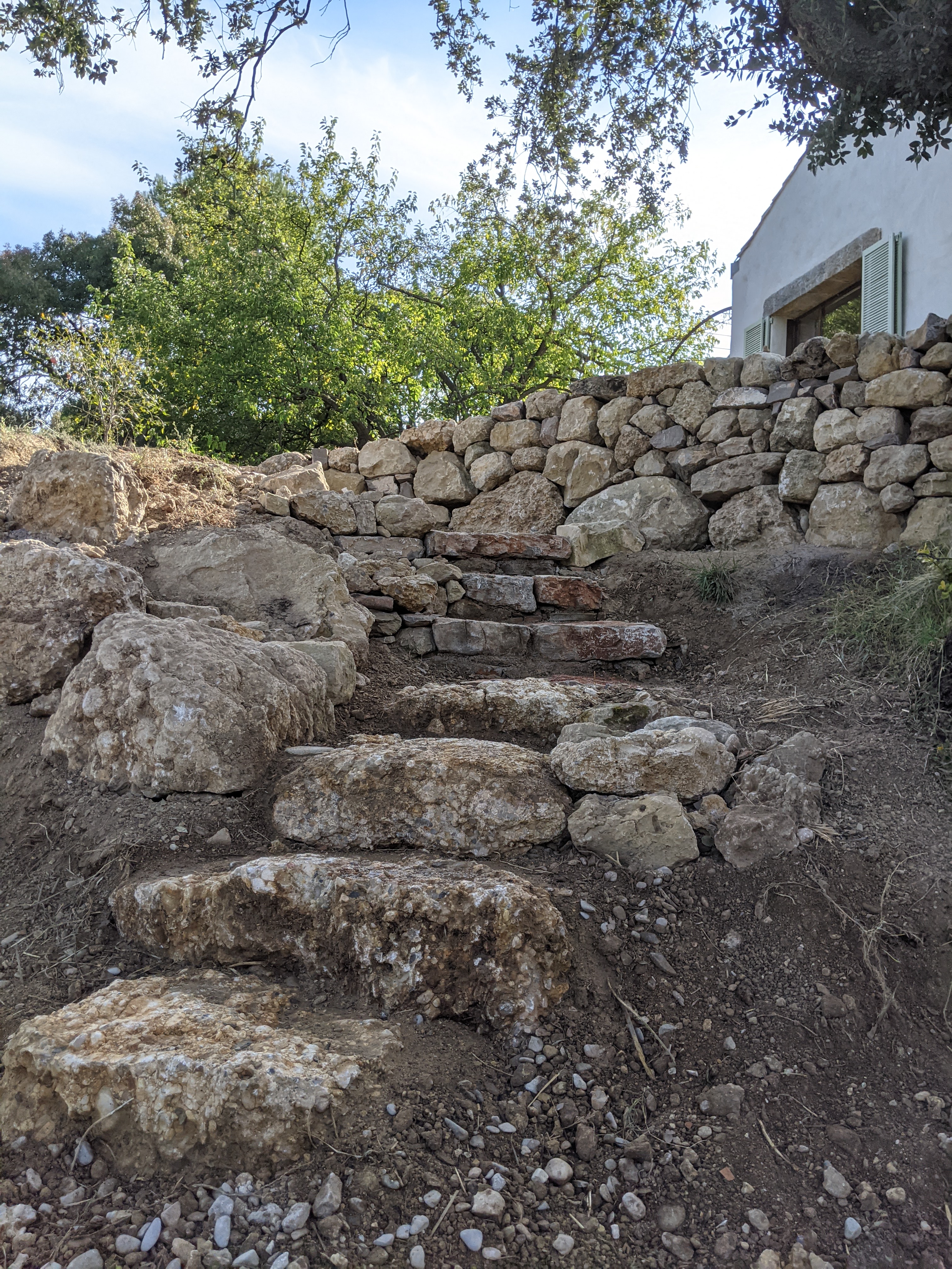 L’idée de départ était de Réaménager un enrochement en escalier/sentier avec réalisation d’un pavage à sec pour constituer un cheminement afin d’accéder depuis la maison au reste du jardin.