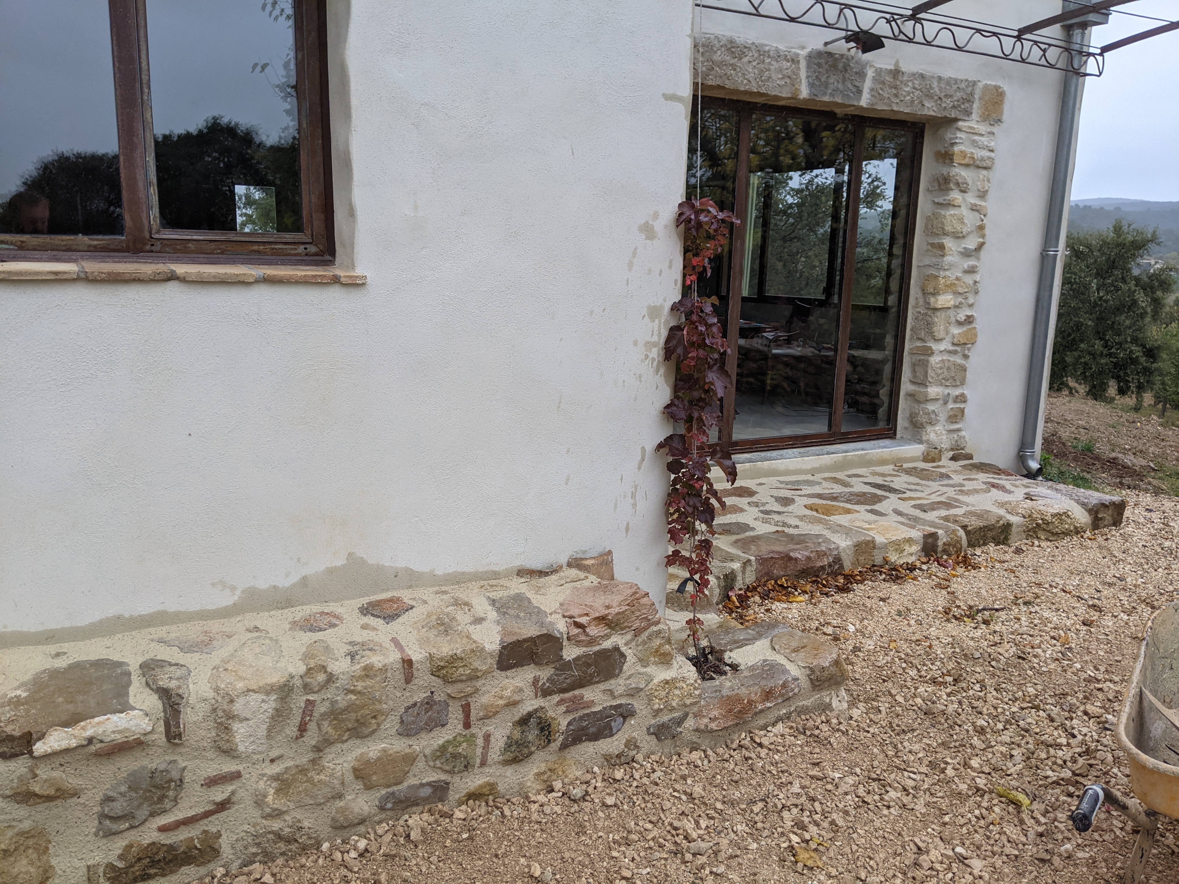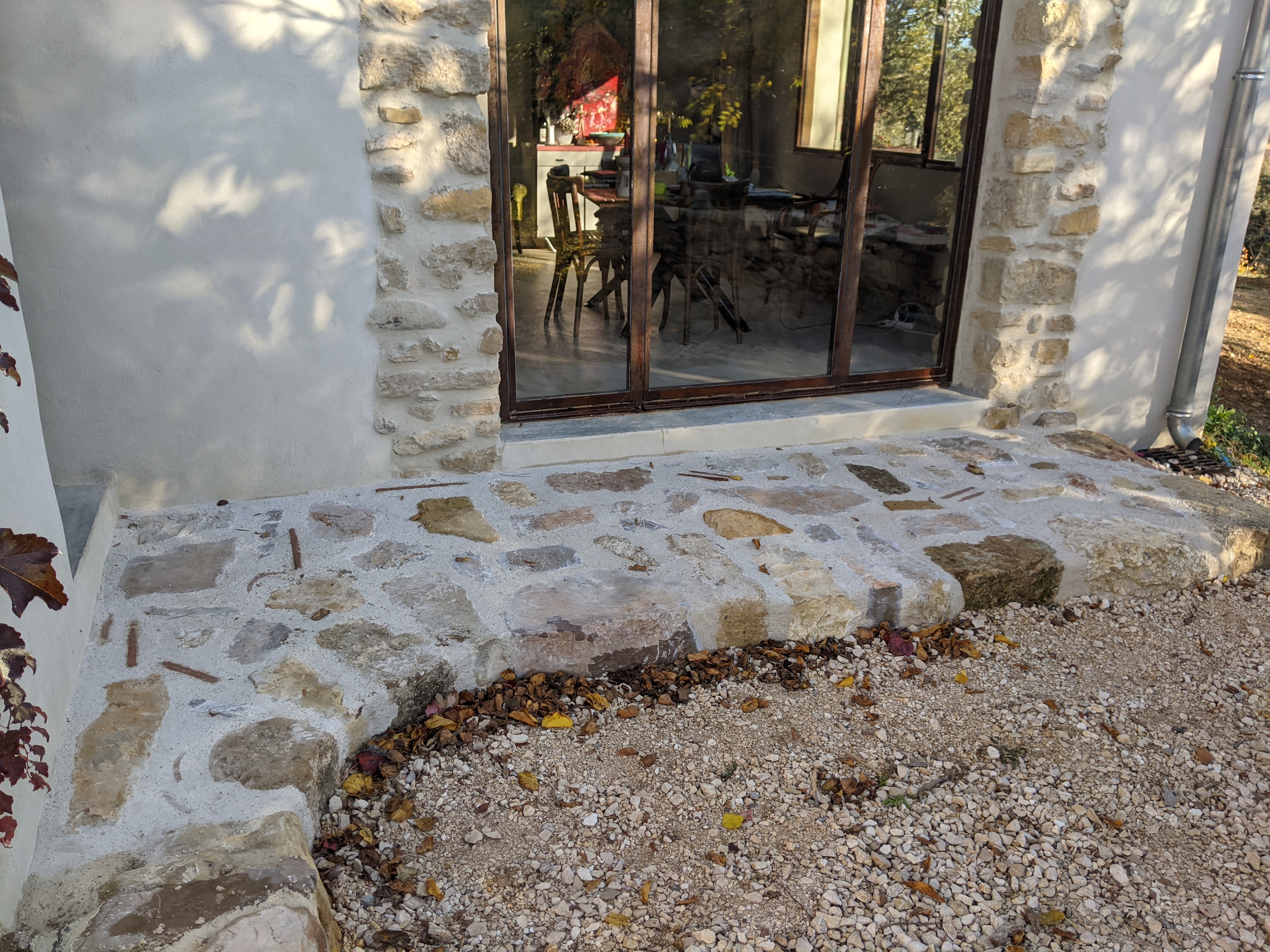En complément de cette première partie à mi-chemin entre paysagisme et maçonnerie nous avons réalisé également contre la maison un muret et une terrasse en pierre maçonnées, hourdées au mortier de chaux NHL 3,5. Là aussi nous avons mixé le style de pierres.