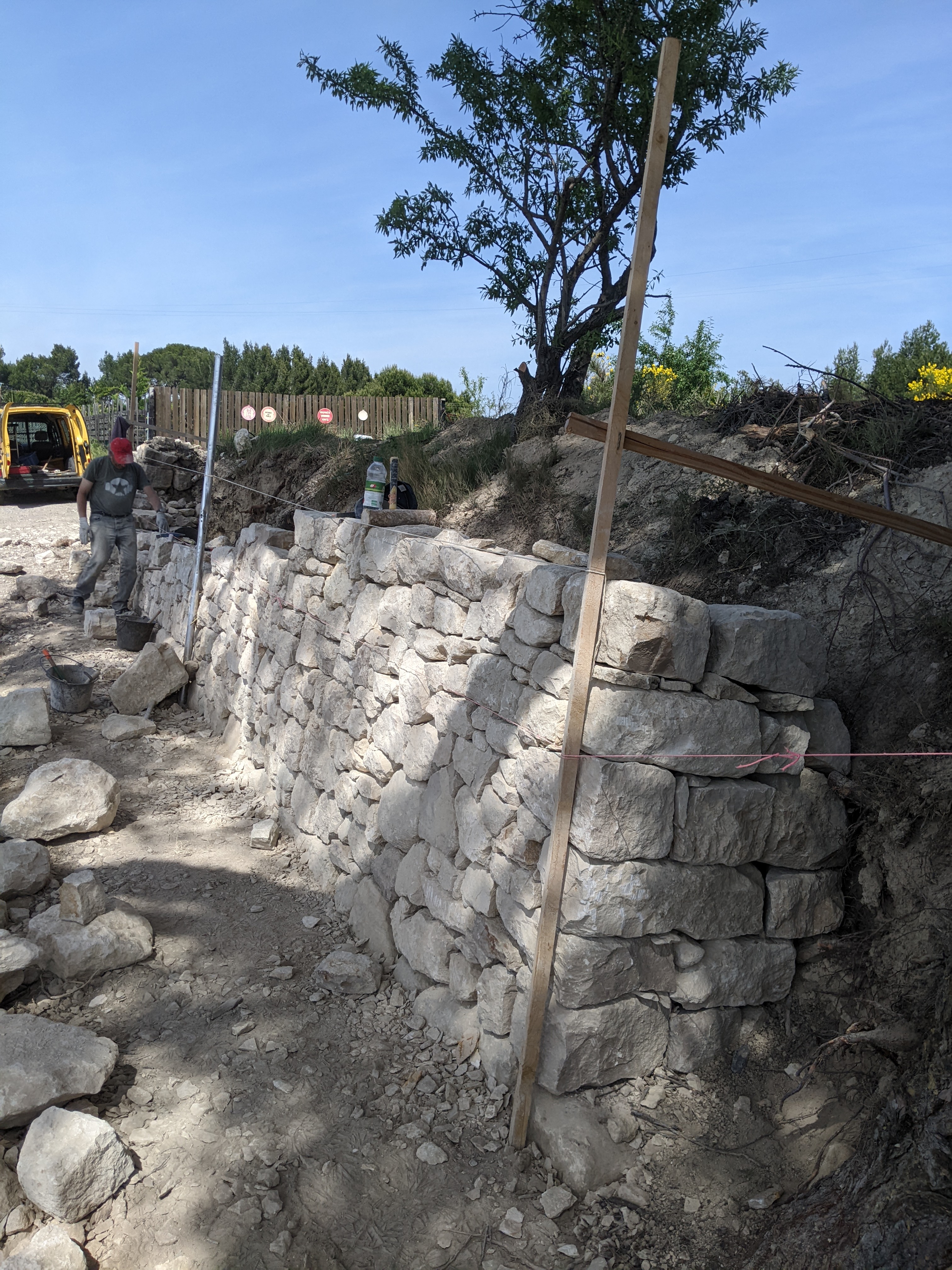 Reconstruction d’un mur de soutènement à pierre sèche le long de la départementale D6009, à l’entré de Prat de Cest pour le conseil général de l’Aude.