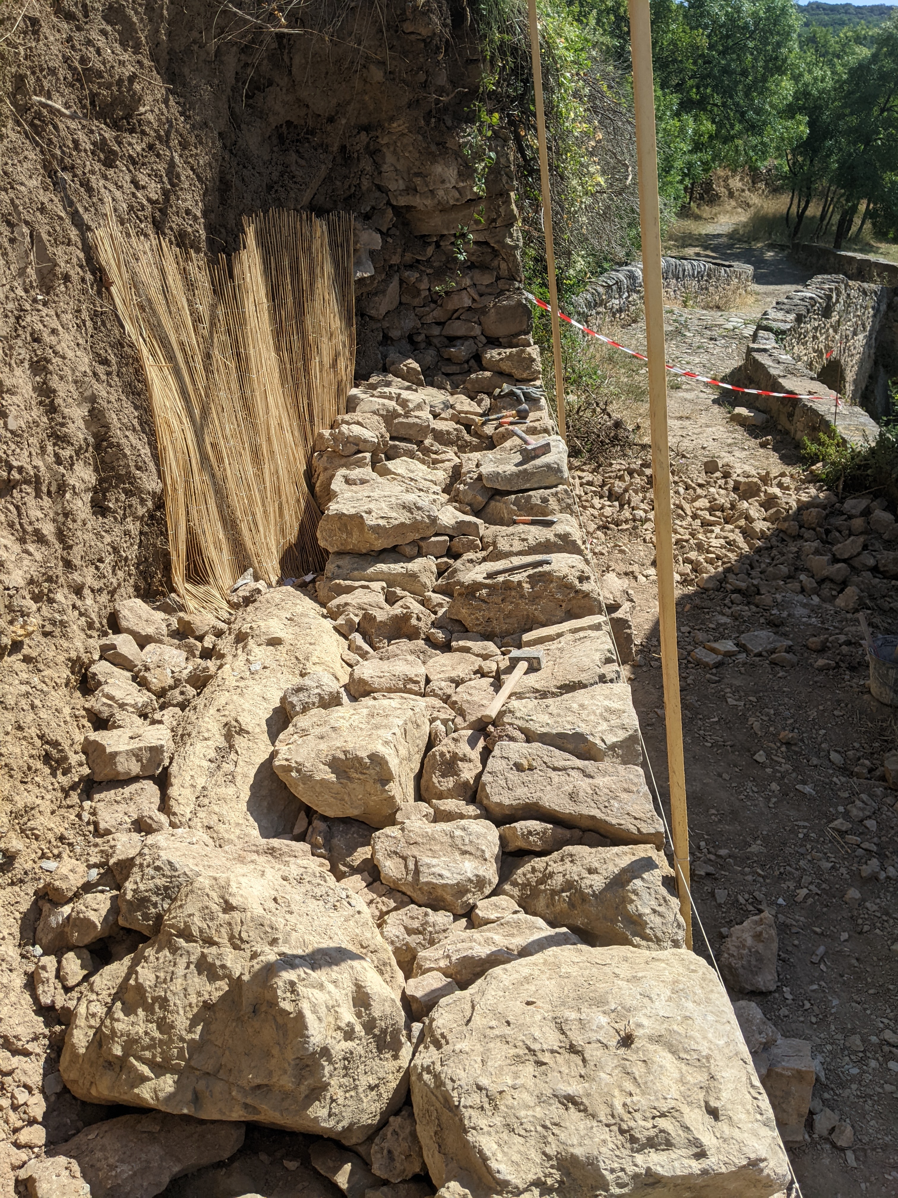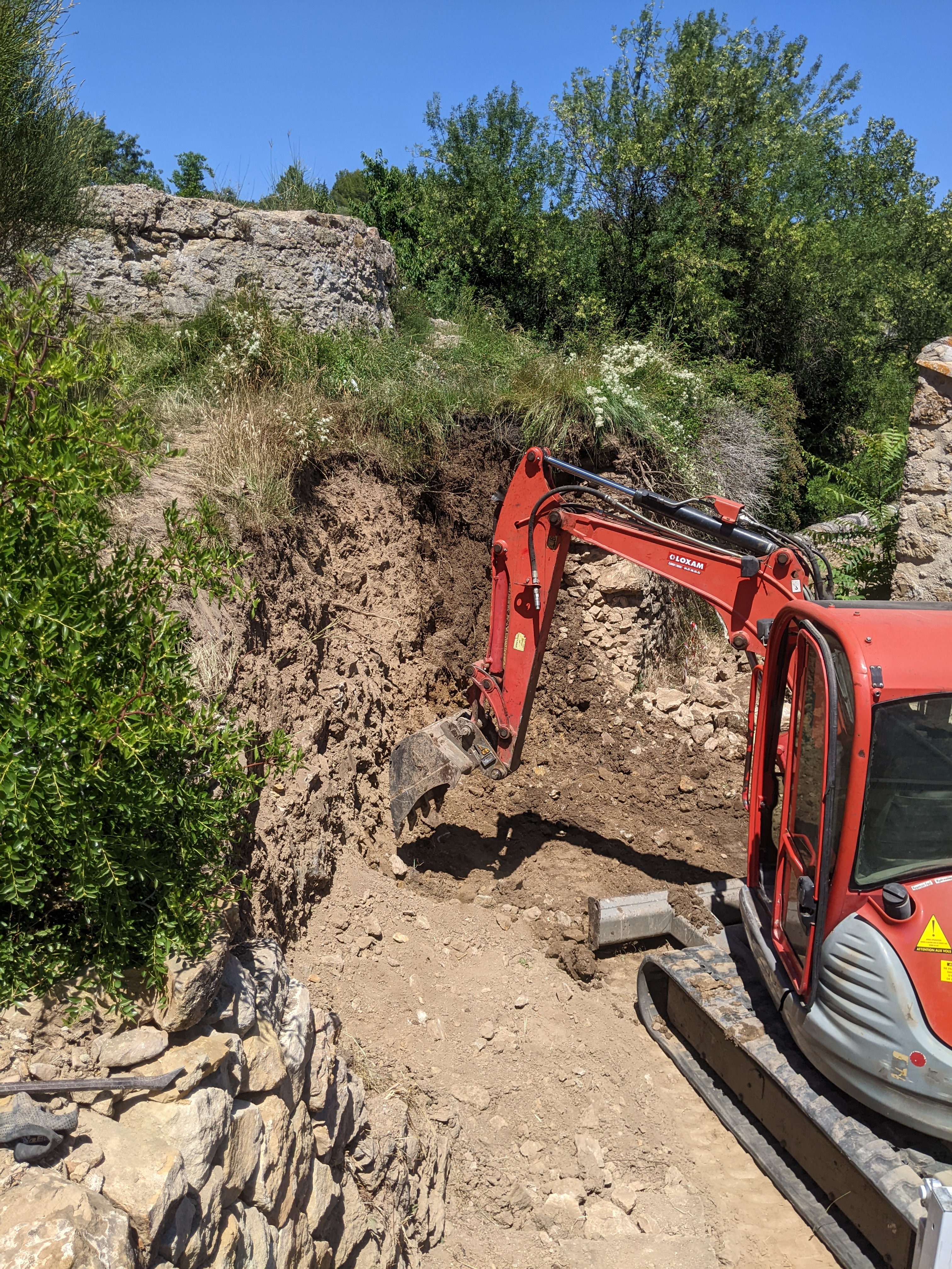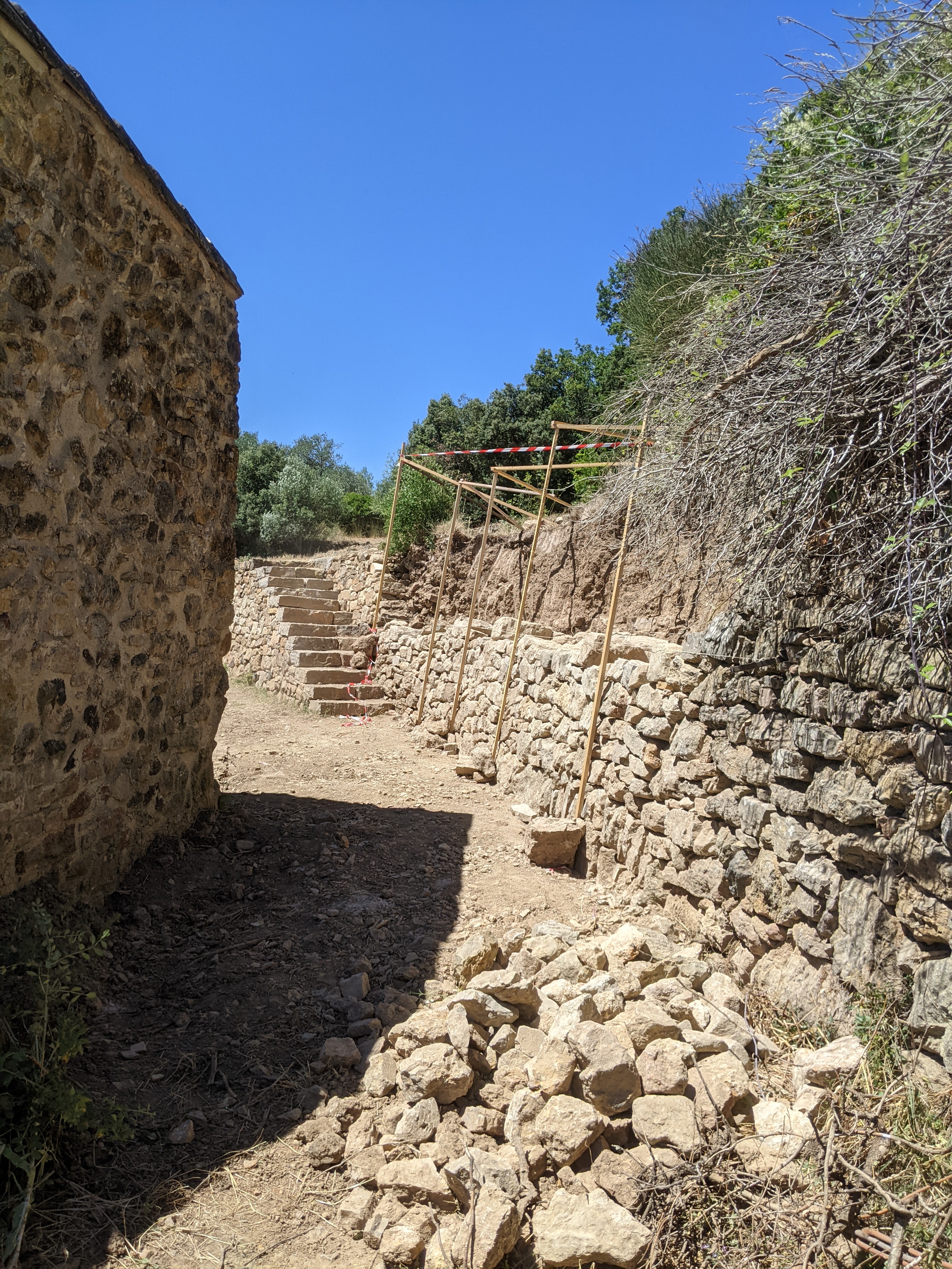 A la suite de l’escalier réalisé en 2021, reconstruction d’une partie de mur de soutènement effondrée. Brèche d’une dizaine de mètre de long avec une hauteur maximale de 3m de haut.