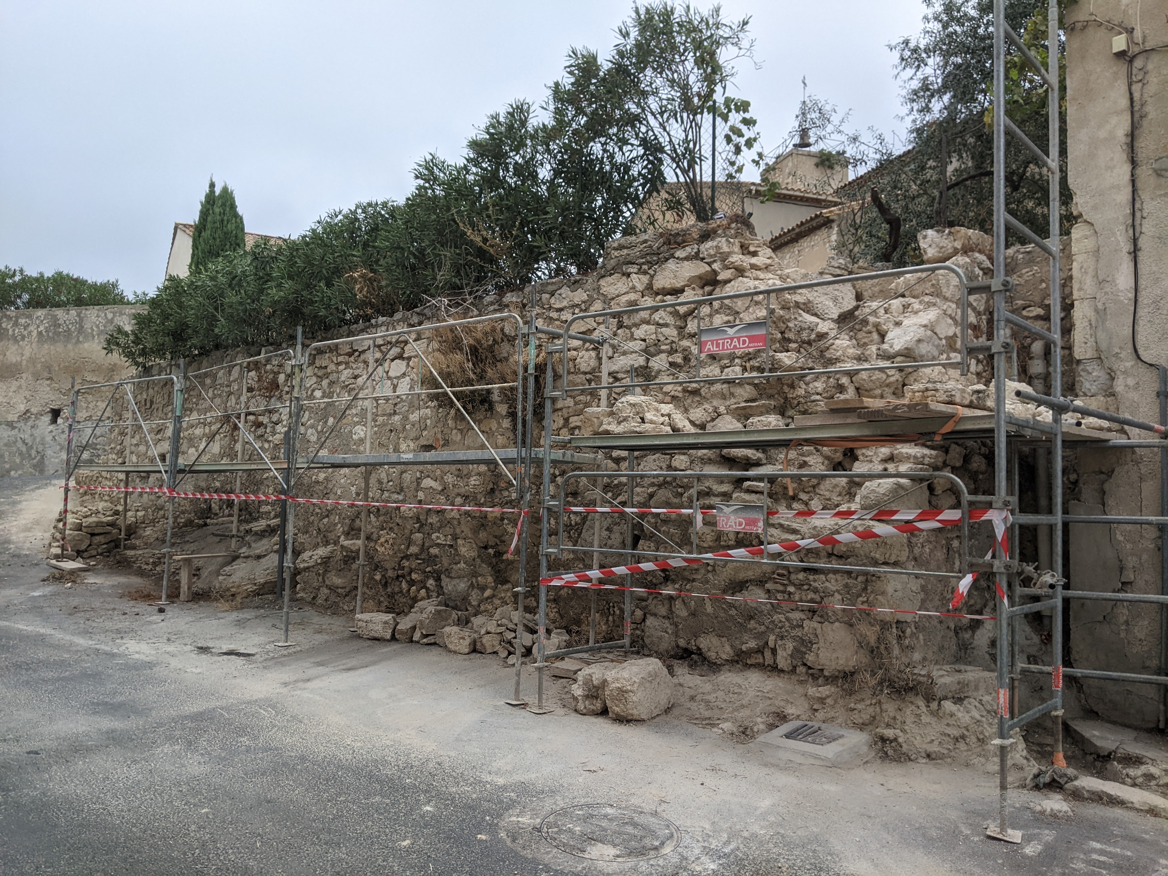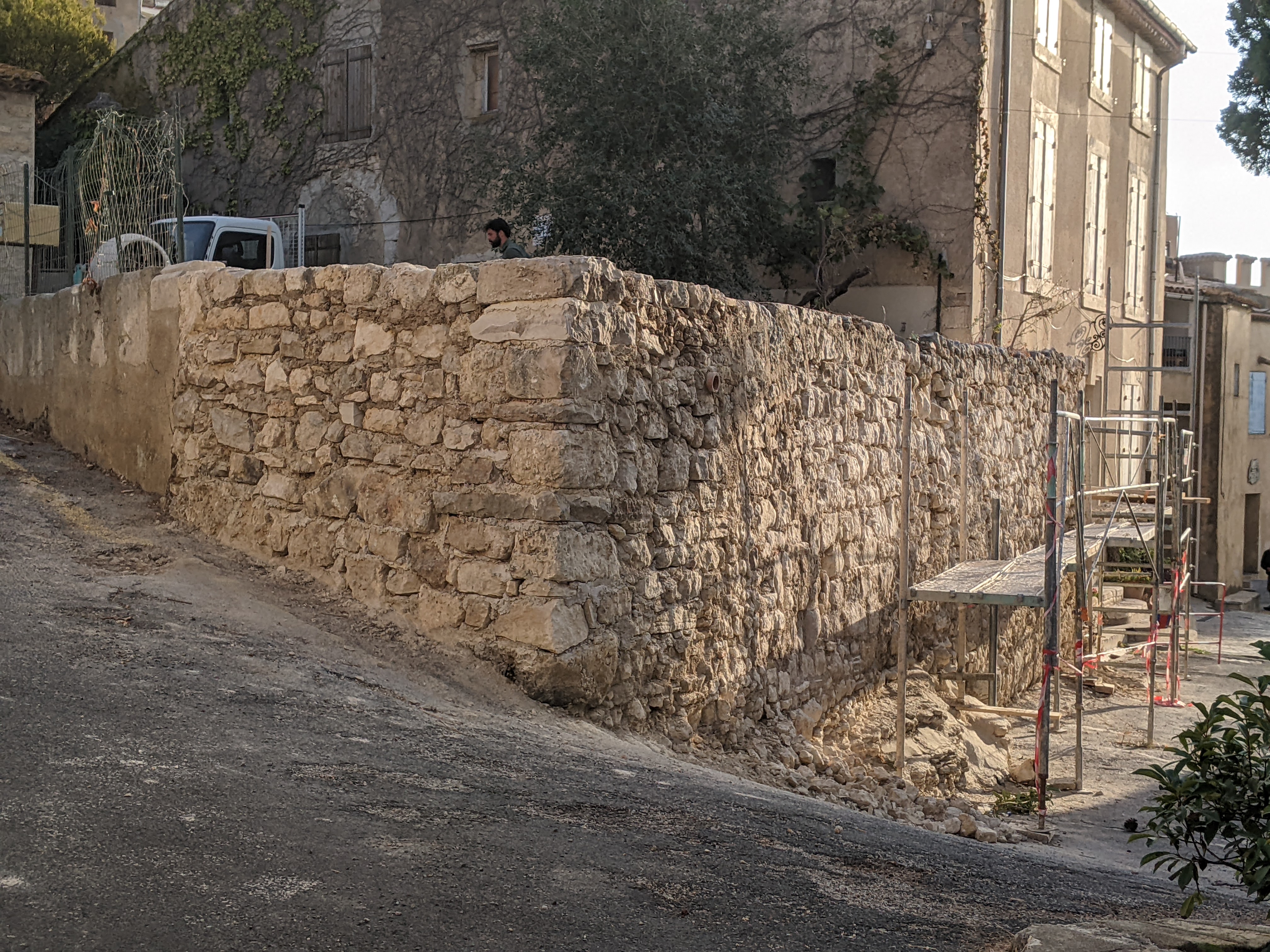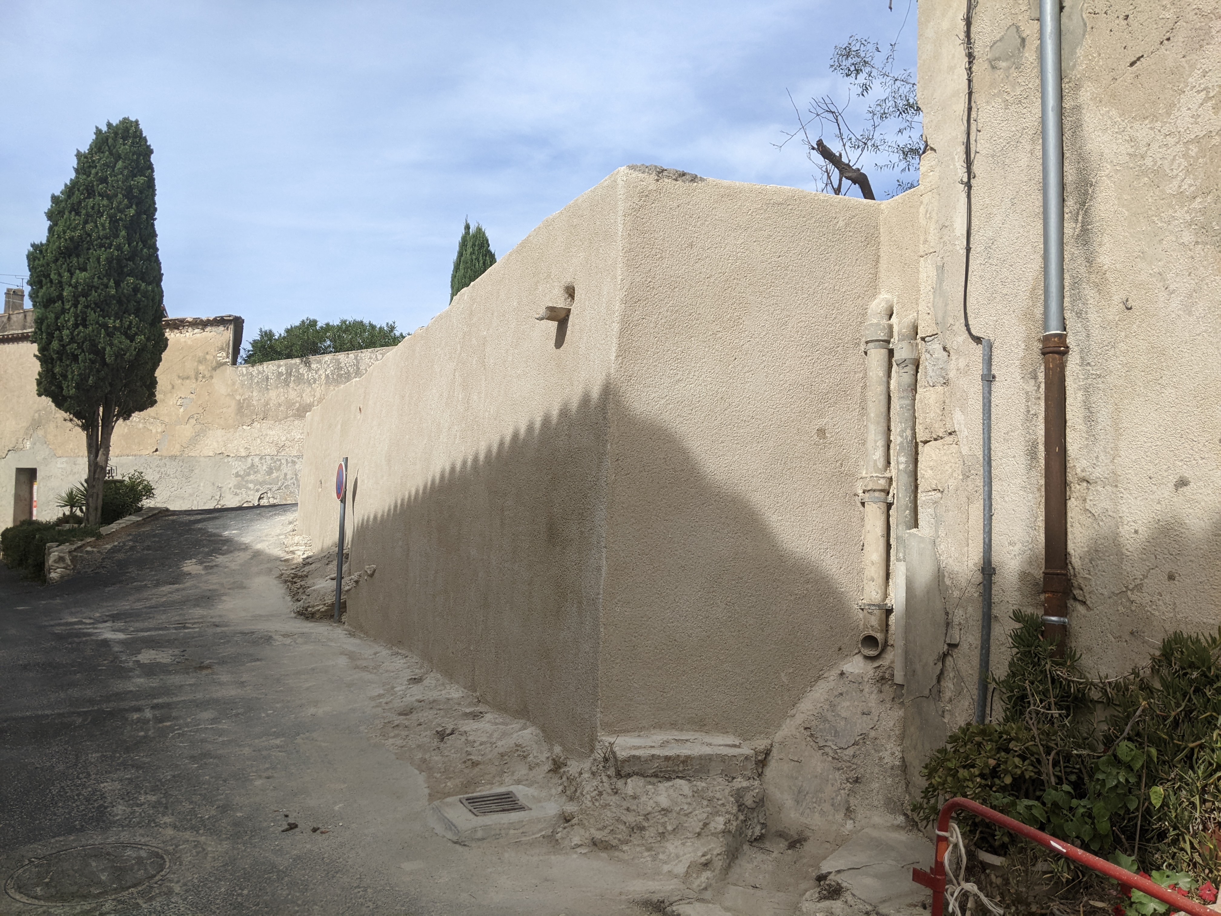Il s’agit dans ce cas d’un mur de soutènement en pierre calcaire maçonné qui est fragilisé au niveau de deux angles par des écoulements d’eau et des racines de végétaux.