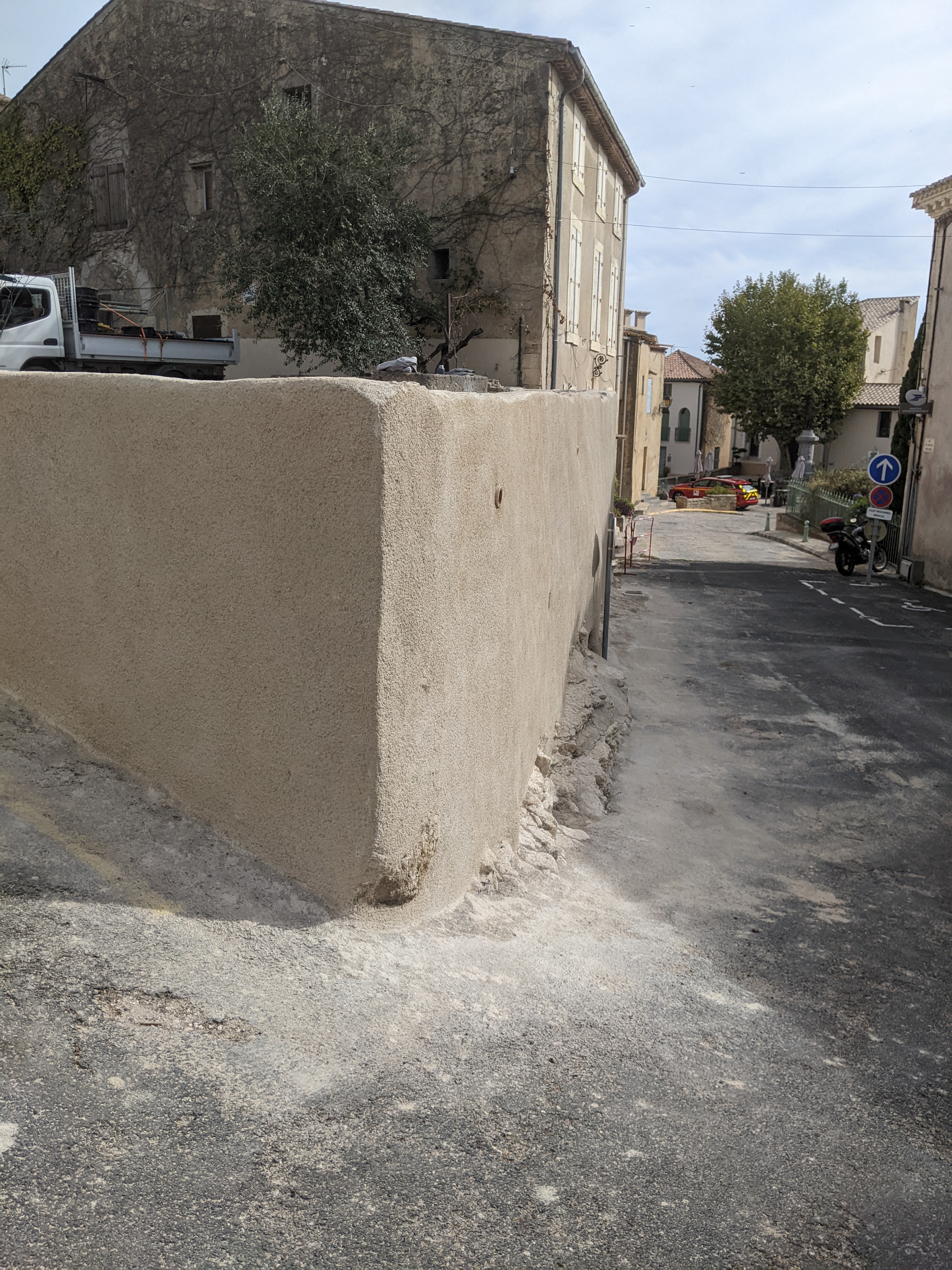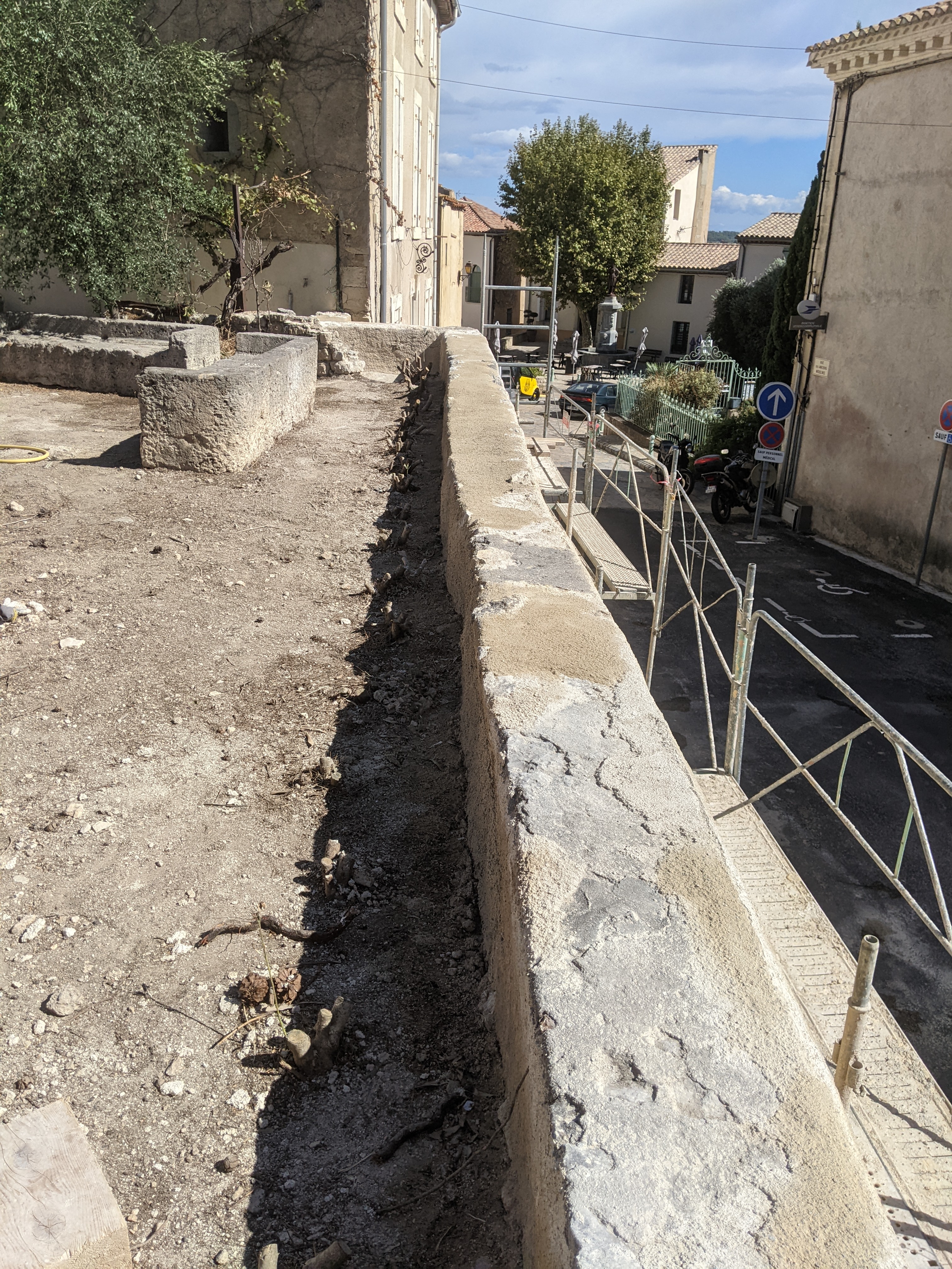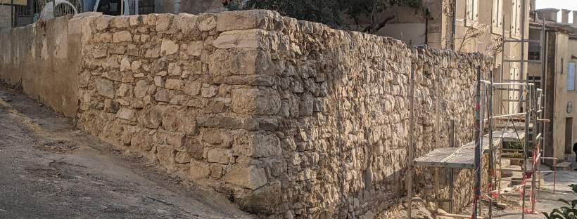 Il s’agit dans ce cas d’un mur de soutènement en pierre calcaire maçonné qui est fragilisé au niveau de deux angles par des écoulements d’eau et des racines de végétaux.