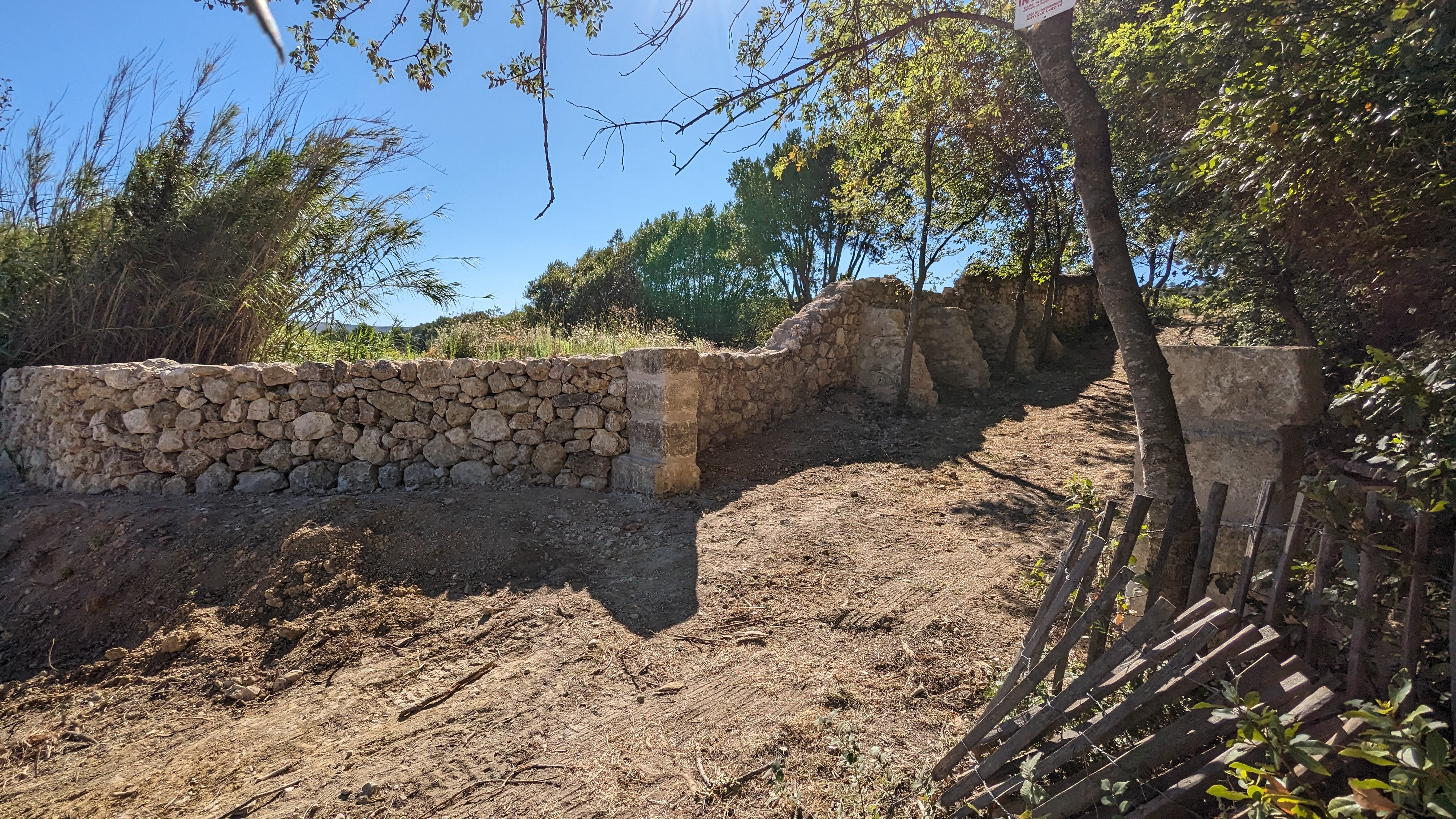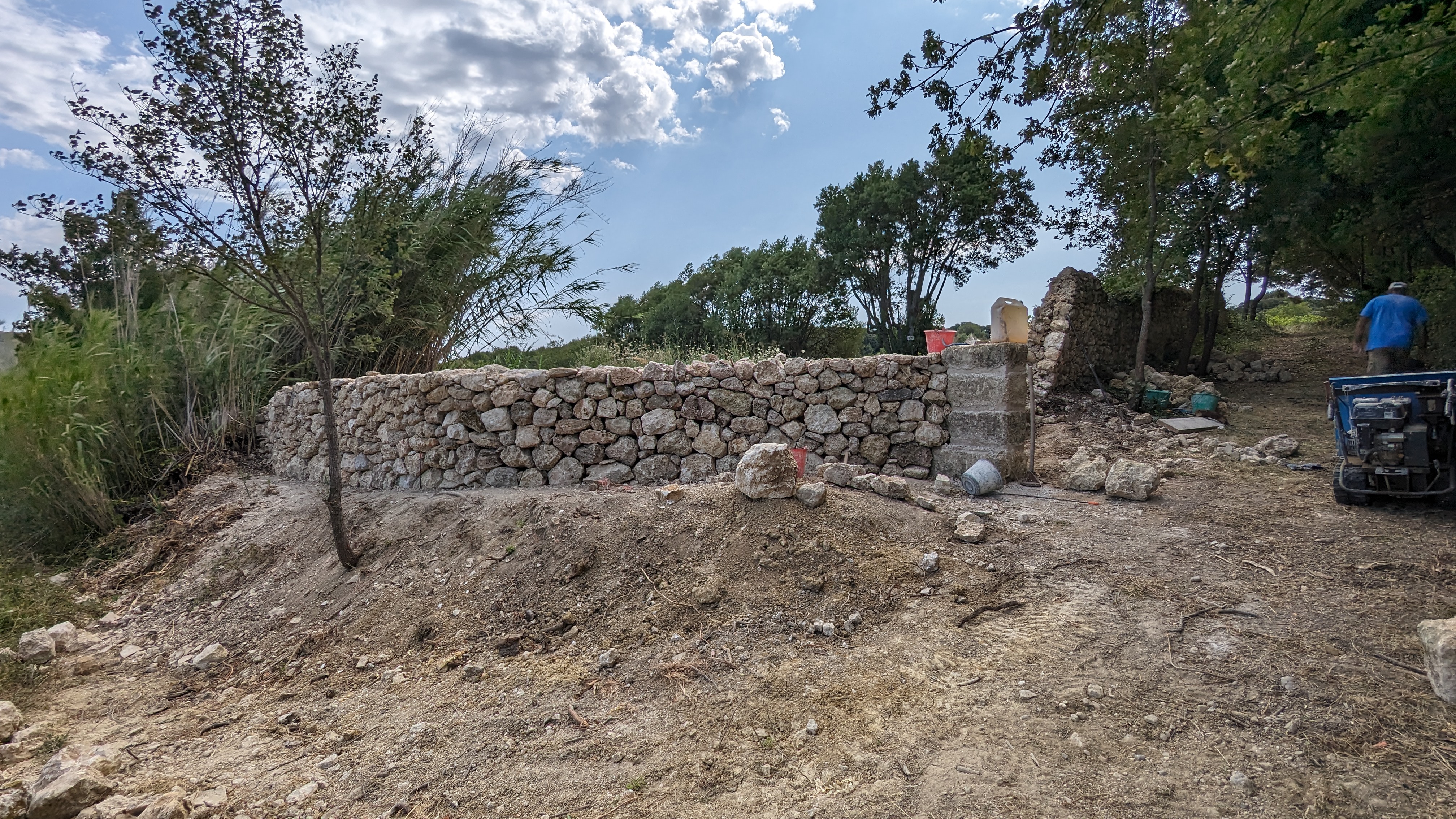 Aménagement paysager avec contruction d’un muret de soutènement à pierre sèche avec parapet.