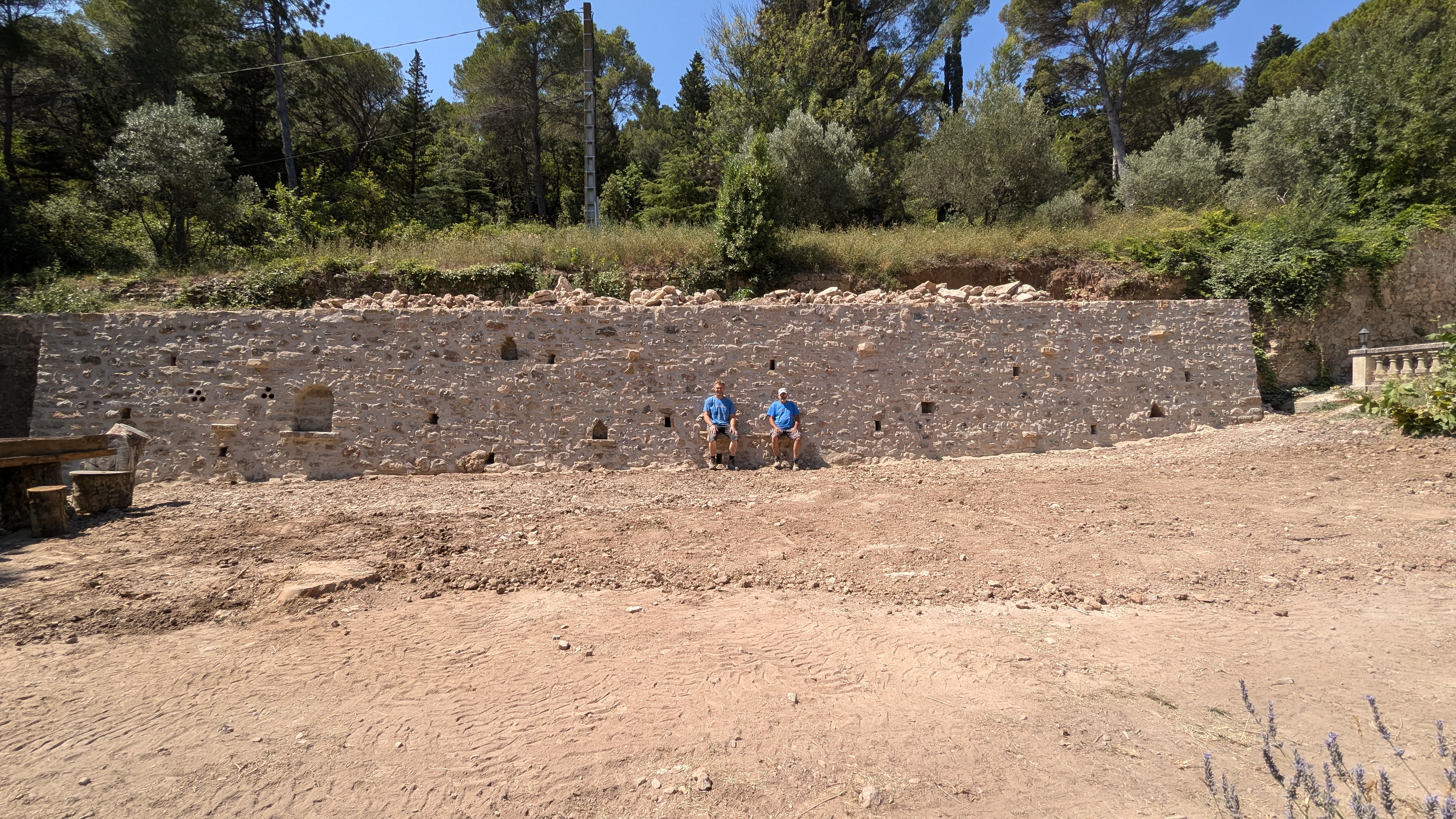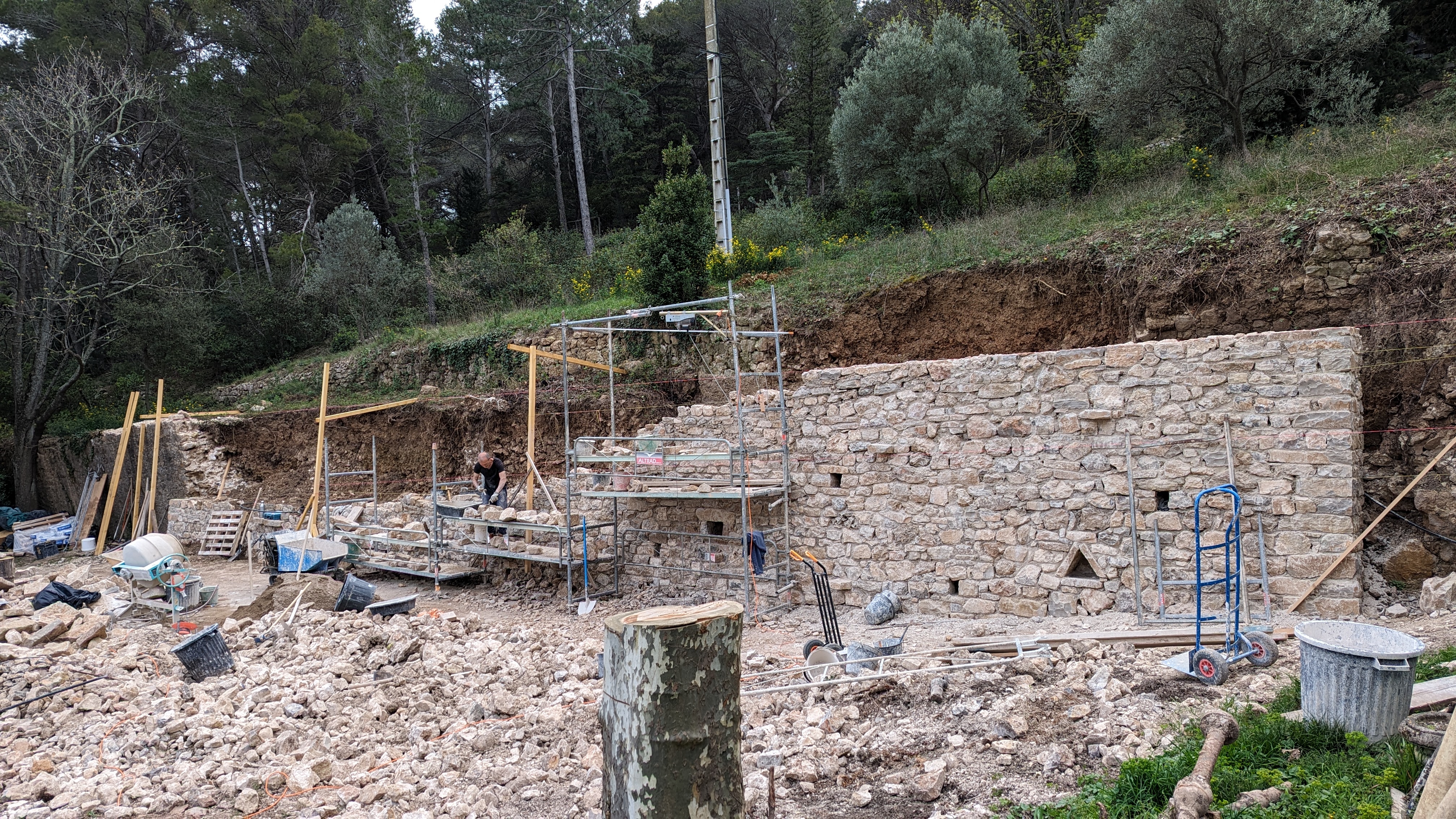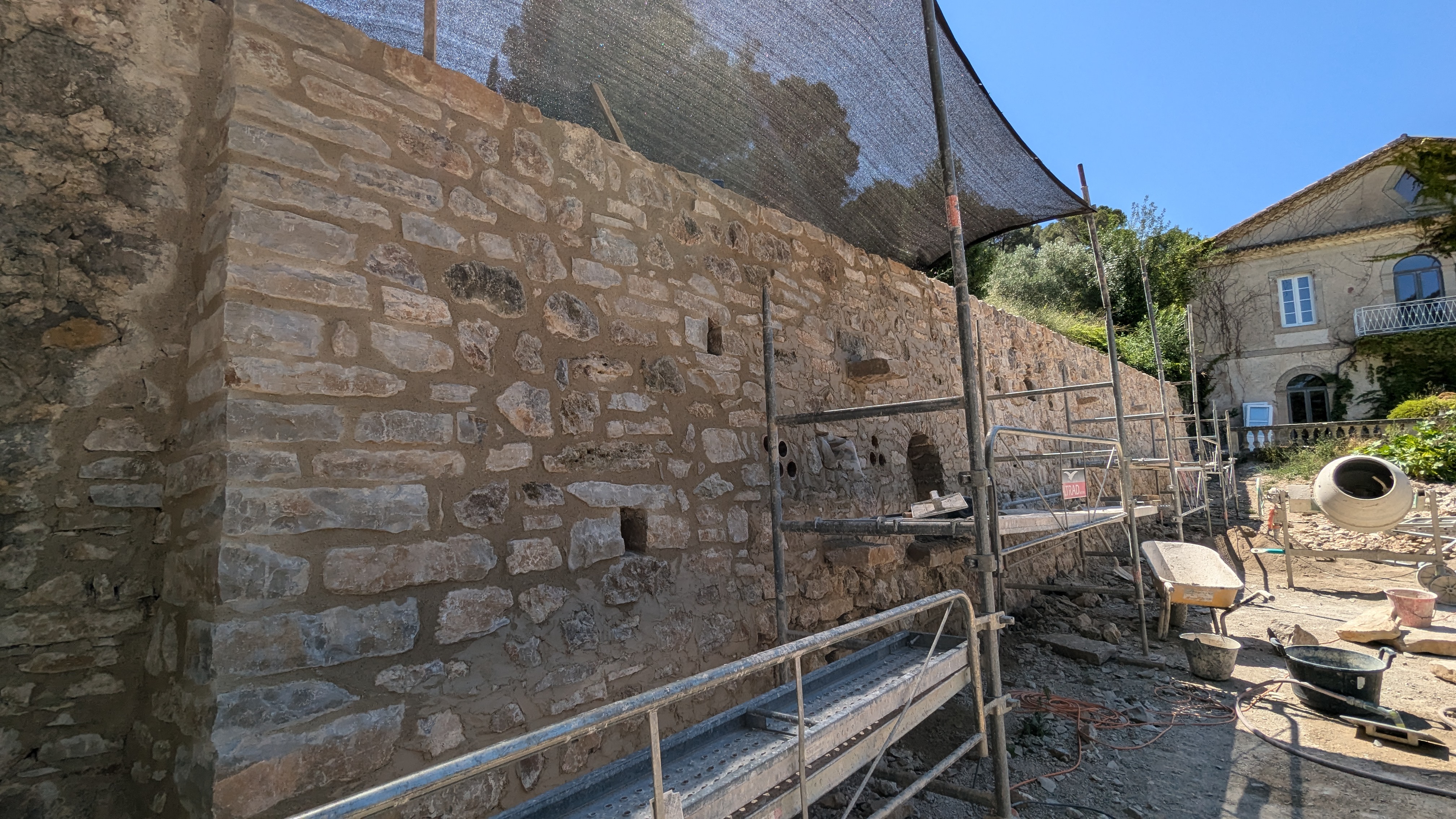 Le mur a été reconstruit avec les pierres de récupération du site ainsi que 24 mètres cubes complémentaires de pierres (calcaire de la carrière de Sauclières).