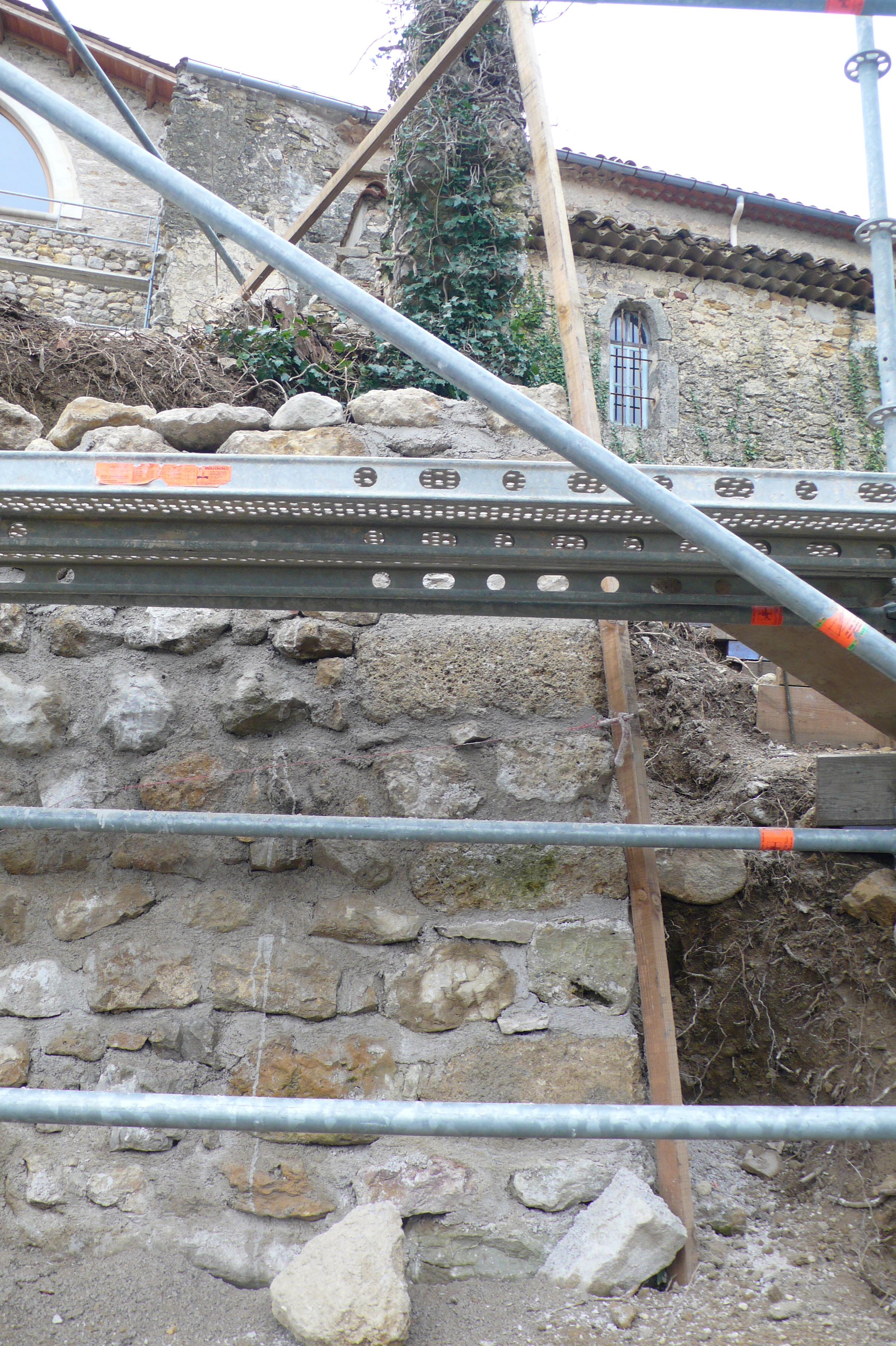 Réparation brèche en sous-oeuvre à pierre sèche – mur de soutènement Château de Clermont L’Hérault 34800