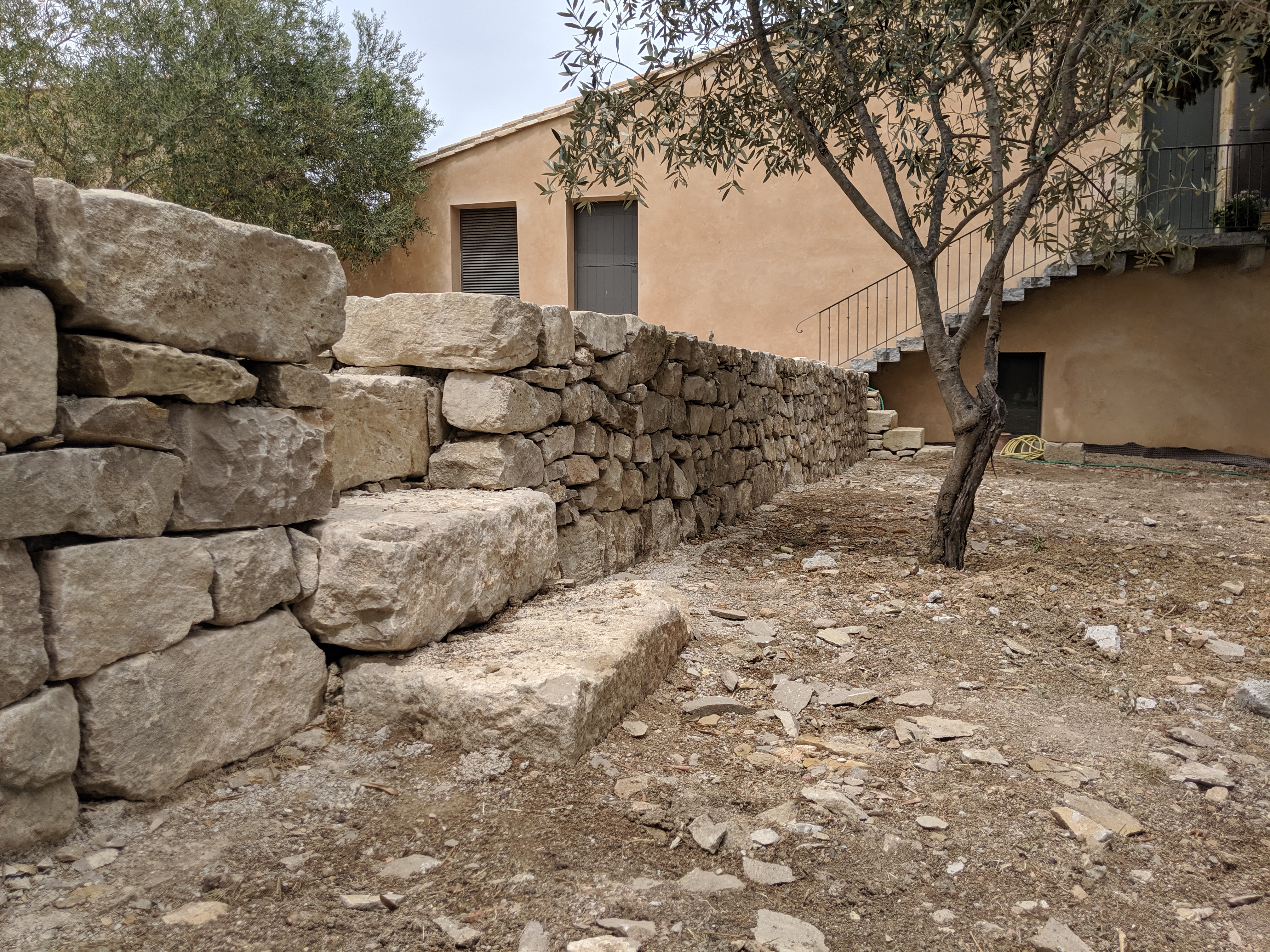 Mur aspect pierre sèche maçonné à la chaux et escalier – Villeveyrac 34560